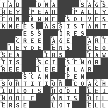 ACROSS 1. Small boy 4. Heredity factor (abbr.) 7. Droops 11. Marina Del _, California 12. Lightbulb-shaped fruit 13. Friendly 14. A really long time 15. Queen of England 1702-14 16. Finds the solution 17. Leg joints 19. Aide 21. Double-curved letter 23. Angers 24. Algonquian 25. Personal question 26. Nonscientific branch of learning 29. Miss Universe 1986, Barbara Palacios _ 30. Followers of ems 31. Corporate head (abbr.) 32. Ocean 33. Big collection agency 34. The 23rd letter of the Hebrew alphabet 35. It is 36. _-fi 37. Sir (Sp.) 40. Portuguese money of account (variant) 41. Area sheltered from the wind 42. Having or resembling wings 43. Glance over 45. Writing instrument 46. Drawing lots 51. Team commander 55. Foolish or stupid persons 56. Carrot, for example 58. Flowery wreath 59. Having high moral qualities 60. Pismires 61. Petroleum 62. Celtic language 63. Car dealer's back yard 64. Pipe bend DOWN 1. Long journey 2. A really long time 3. Centimeter-gram-second unit of force 4. Lair 5. Nanny 6. Ancient Greek god of war 7. Table seasonings 8. Inventor's middle name 9. Small, secluded valley 10. System (abbr.) 12. Went by 13. Introduce or present, as a question 16. Titles for men of rank and authority 18. Suggestive of the supernatural 20. Omens 22. Observe 24. Stop 25. Nest on high 26. Thespian 27. Stern 28. Pull behind 29. Wig 32. Title for a knight 33. Ancient Celtic tribe of eastern Britain 36. Narrow boards 37. Plant excrement 38. Chooses 39. Billionth: prefix 43. Fur scarf 44. Quote 46. Trig term 47. Aroma 48. Teases 49. Relating to the mouth 50. Words to Nanette 52. _ vera 53. To provide with a ceiling 54. Land elevation 57. Baseball player Mel