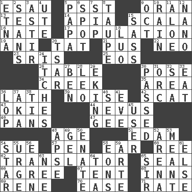 ACROSS 1. He sold his birthright 5. Inconspicuous attention getter 9. Northwest Algerian city 13. Trial 14. Capital of Western Samoa 15. Any of the three canals of the cochlea 16. Nathan's nickname 17. Census information 19. Cuckoo 20. Make lace 21. Fluid product of inflammation 22. Modern: prefix 23. Indian titles of respect 25. Greek goddess of the dawn 26. Eating place 30. Airs 34. Small stream 35. Type of rug 36. Thin strip of wood or metal 39. Annoying sound 42. Jazz singing style 43. Migrant worker of the '30s 44. Mole, birthmark 46. Zero-star reviews 47. Honkers 48. Mature 51. Dutch treat 54. Institute legal proceedings 57. Animal enclosure 58. Hearing organ 60. To sift 62. Interpreter 65. Lick closed 66. Match 67. Portable shelter 68. Restaurants 69. French philosopher Descartes 70. Relaxation 71. Pace DOWN 1. Inactive volcano in Sicily 2. Actors Connery and Penn 3. Moving about 4. Shoshoni 5. Dad 6. Specific locale 7. Small drink 8. Grayish beige 9. Sep. follower 10. Precipitation 11. Medicinal plant 12. Billionth: prefix 15. Backtalk 18. Nilotic language 20. Russian ruler of old 24. Strong, restless desires 27. Benjamin's nick name 28. Lion 29. Supplementing with great effort 30. Went by 31. The grampus (Milton) 32. Ocean 33. Consume 36. Chop off 37. Alias (abbr.) 38. Shallow baking pan 40. Observe 41. Night before a holiday 45. One who uses or employs something 48. Domed church section 49. Set 50. Related on the mother's side 52. Sports stadium 53. Intended 54. Play the lead 55. Goad 56. Merit 58. Immeasurably long periods of time 59. Johnson of "Laugh-In" 61. Otherwise 63. Born 64. Afternoon social gathering 65. Title for a knight