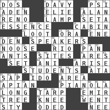 ACROSS 1. Two (Sp.) 4. _ Jones' Locker 8. 23rd letter of the Greek alphabet 11. An important port of Yemen 13. Writer Wiesel 14. Actor Alda or Thicke 15. Western Nevada city 16. Desk light 17. Bristle 18. Gist 21. Apartment or room in a ship 22. Plunder 23. Mouth or opening 25. Compass dir. 26. Lair 29. Orators 32. Trap for birds or small mammals 34. _ de Janeiro 35. Baking dish 38. Pismires 39. Locates 41. Ancient Greek god of war 43. Arrange properly for use 44. Black tropical American cuckoo 45. Get up 46. SAT takers 50. _ moment's notice (2 wds.) 51. Plant excrement 54. Wedding promise 55. Type of rug 57. Bee-related 59. Player piano 63. Having great length 64. Canvas cover 67. Independent ruler or chieftain 68. Family _ (genealogy) 69. Leg joint 70. Gone 71. Filthy place 72. Wrote a lyric poem 73. Born DOWN 1. Have the gumption 2. Lyric poems 3. Elected reps. 4. Erase 5. Chicken ___ king 6. Zeal 7. Slangy assent 8. Military trainee 9. Smooth fabric 10. Silly 12. Christmas carol 14. White ___ sheet 19. Olfactory organ 20. Police officer (slang) 21. Auto 23. Migrant worker of the '30s 24. Vintage cars 26. Heredity factor (abbr.) 27. Immeasurably long periods of time 28. Observe 30. Nick name for Arthur 31. Practice fight 33. Fast planes 36. Roberta Peters solo 37. A home for chicks 39. Saudi Arabian king (1953-1964) 40. _ china 42. Ocean 45. At sea 47. Shallow baking pan 48. Slept 49. Three (prefix) 51. Table seasonings 52. To the left, to Queeg 53. Abounding in pines 56. Afresh 58. Mature 60. Sign of something about to happen 61. Actor's bit 62. Johnson of "Laugh-In" 64. Ring climax 65. Added to 66. To separate or throw off
