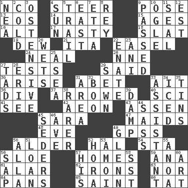 ACROSS 1. Non-commissioned officer (abbr.) 4. Navigate 9. Introduce or present, as a question 13. Greek goddess of the dawn 14. A salt of uric acid 15. Eras 16. The first octave above the treble staff 17. Thoroughly unpleasant 18. Narrow board 19. Morning condensation 21. Call ___ day 22. Artist's stand 24. Anneal 26. Compass dir. 27. Trials 29. Expressed in words 30. Get up 31. Collude with 33. Small island 36. HTML Container Element 37. Moved like an arrow 40. _-fi 41. Observe 42. Period of immesurable duration 43. NE Netherlands city 45. "Two Mules for Sister ____" 47. Women servants 48. Night before a holiday 49. Global Positioning Systems (abbr.) 50. Tree or shrub in the Birch family 52. Actor Linden 54. R.R. building 56. A type of plum 57. Residences 59. Santa ___, CA 61. Having or resembling wings 62. Metal shackles 63. And not 64. Baking dishes 65. Virtuous person 66. Make lace DOWN 1. Teachers' org. 2. Having a low temperature 3. Clearly or manifestly demonstrative 4. Player for Phoenix 5. Hang back 6. Compass direction 7. Singer James 8. Marina Del _, California 9. Went by 10. Stare 11. Lick closed 12. Eastern Standard Time (abbr.) 20. Soaks 22. Related on the mother's side 23. Black tropical American cuckoo 25. Toward the sea 27. Small amounts or degrees 28. 4th largest of the Great Lakes 29. Stitched 31. Type of rug 32. Sometimes accompanies a hiss 33. Aide 34. On the rocks 35. Airtight sealed metal containers 38. Less widely known 39. Moist 44. Backtalk 45. Spring feasts 46. "___ Maria" 49. American astronaut and politician John 50. Silent film actress Nazimova 51. Grant temporary use of 52. Israeli folk dance 53. Mine, in Marseilles 55. Small Philippine buffalo 56. Plant excrement 57. Part of HMS, perhaps 58. Fast jet (abbr.) 60. Tate display