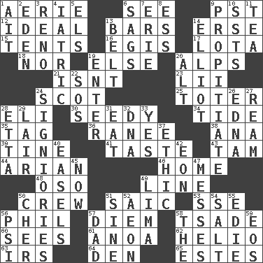 ACROSS 1. Nest on high 6. Observe 9. Pacific Standard Time (abbr.) 12. Standard of perfection 13. Long, evenly shaped pieces 14. Celtic language 15. Portable shelters 16. The front part of a cuirass 17. Globular water bottle used in Asia 18. And not 19. Otherwise 20. High mountains 21. Is not 23. Cards in a Roman deck? 24. Native of Scotland 25. Carrier 28. Connecticut Ivy Leaguer 30. Sleazy 34. Periodic rise and fall of the sea level 35. Label 36. Indian princess (variant) 38. Santa ___, CA 39. Prong on a fork 41. Clothes sense 43. Scottish cap 44. Believer in; advocate of (suffix) 46. Dwelling 48. Bear (Spanish) 49. Actor's bit 50. Group working together 51. Ketch in the Levant 53. Compass dir. 56. Silvers or Donahue 57. South Vietnam president (1954) 58. Sadhe (variant) 60. Perceives with the eye 61. Small Philippine buffalo 62. Sun: prefix 63. Big collection agency 64. Lair 65. _____ Park, CO DOWN 1. Small island 2. Locale of original sin 3. Western Nevada city 4. Of or pertaining to medicine 5. Raised railways 6. Droops 7. One of the Great Lakes 8. Double-curved letter 9. Conciliate 10. Fast planes 11. Afternoon social gathering 13. Waist strap 14. American author Paul (1891-1958) 19. Keyboard key 20. Keyboard modifier key 22. Distress signal 24. Seigniories (variant) 26. Pulitzer Prize-winning author Ferber 27. 480, 500 or 516 sheets of paper 28. Singer James 29. Den 31. Consume 32. Heredity factor (abbr.) 33. Affirmative reply 37. Value system 40. Artist's stands 42. A really long time 45. Immediately 47. Makes clutter 49. Pale green bean 50. "Mermaids" star 51. Trig term 52. Period of immesurable duration 54. Table seasoning 55. Singer Brickell 56. Air pressure measure (abbr.) 57. June honoree 58. Definite Article 59. Greek goddess of the dawn