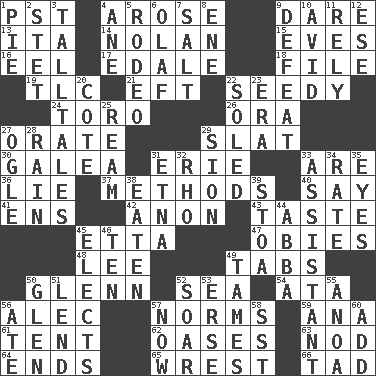 ACROSS 1. Pacific Standard Time (abbr.) 4. Came up 9. Have the gumption 13. Call ___ day 14. Pitcher Ryan 15. Nights before holidays 16. Snakelike fish 17. Peak District village in England 18. Do some clerical work 19. Affectionate concern, for short 21. Bank Draft (abbr.) 22. Shabby and untidy 24. "Corrida" creature 26. Mouth or opening 27. Declaim 29. Narrow board 30. An organ shaped like a helmet 31. 4th largest of the Great Lakes 33. "We ___ not amused" (Victoria) 36. Whopper 37. Modes 40. Declare 41. Followers of ems 42. At once, immediately (arch.) 43. Clothes sense 45. Singer James 47. Off-Broadway awards 48. Area sheltered from the wind 49. Bar bills 50. American astronaut and politician John 52. Ocean 54. "One Day ___ Time" 56. Actor Baldwin 57. Typical standards 59. Santa ___, CA 61. Portable shelter 62. Fertile tracts in a desert 63. Lower and raise head in agreement 64. Conclusions 65. Obtain by seizing forcibly or violently 66. Bit DOWN 1. Sliced dessert 2. Proofreading order 3. Baron Munchausen's specialties 4. A saturated hydrocarbon 5. Cowboy competition 6. Norwegian king 7. Table seasoning 8. Compass dir. 9. Outscore 10. Enthusiastic 11. Have confidence or faith in 12. Compass dir. 20. ____ d'Azur (French Riviera) 22. Having a sole or soles 23. Epoch 25. 480, 500 or 516 sheets of paper 27. Stare at amorously 28. Water falling in drops from the sky 29. The Jewish people; Israel 31. Inactive volcano in Sicily 32. 17th letter of the Greek alphabet 33. Aide 34. Pace 35. Sight organs 38. Ingested 39. Portico 44. Swedish rock group 45. Opts 46. "___ Little Indians" 49. Corrects by punishment or discipline 50. Small, secluded valley 51. Grant temporary use of 52. Fly high 53. Celtic language 55. Small Philippine buffalo 56. Had dinner 57. Immediately 58. Fast jet (abbr.) 60. Increase