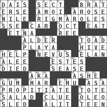 ACROSS 1. Raised platform 5. Religious group 9. Naughty child 13. Celtic language 14. Mine, in Marseilles 15. Came up 16. Mediterranean tributary 17. Frustrating wastes of time 19. Compass dir. 20. Auto 21. Sep. follower 22. Consume 23. Inactive volcano in Sicily 25. Portuguese money of account (variant) 26. Tree or shrub in the Birch family 30. Frog relative 34. Beach, in Buenos Aires 35. Hub of activity 36. Aid 39. Mole, birthmark 42. Style 43. Toward shelter 44. _____ Park, CO 46. Passed on 47. Gospel singer Marvin 48. Alias (abbr.) 51. American tennis player Robert 54. Chewing product 57. Make imperfect 58. Australian flightless bird 60. White ___ sheet 62. Conciliate 65. Carryall 66. First course 67. A slight indication 68. Butter sub 69. Downhill vehicle 70. Set down 71. Adolescent DOWN 1. Habitations of wild animals 2. Get up 3. Small island 4. Perceive with the eye 5. "Two Mules for Sister ____" 6. Arab leader 7. Gear tooth 8. Southeast Indonesia island 9. Sis' sibling 10. Hero or heavy, e.g. 11. At sea 12. Trial 15. Johnson of "Laugh-In" 18. Adept person 20. Give a ring to 24. Slept 27. One of the 12 tribes of Israel 28. Sight organ 29. All-night dance parties 30. College papers 31. Lubricate 32. Actress Gardner 33. Lair 36. Possessed 37. Biblical high priest 38. Area sheltered from the wind 40. Purpose 41. R.R. building 45. Son of Isaac 48. Among 49. Krazy ___ of comics 50. N. Chile seaport 52. White Person, in Hawaii 53. First name in cosmetics 54. Global Positioning Systems (abbr.) 55. Mountain range 56. Undercover agent 58. Needle holder 59. Confront 61. Period of immesurable duration 63. Writing tablet 64. Everything 65. Small child