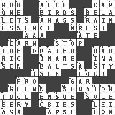 ACROSS 1. Director Reiner 4. Toward shelter 8. Head covering 11. Single 12. Avian creatures 14. Actor Lugosi 15. Allows 17. Collect or gather 18. Water falling in drops from the sky 19. Substance 21. Take or capture by force 23. American Automobile Association (abbr.) 24. Had dinner 25. Merit 27. Discontinue 30. Binary compound 31. Declaimed 34. Male parent 37. River (Sp.) 38. Lacking in sense or substance 39. _ tizzy (2 wds.) 40. Elected rep. 41. Greek mezzo-soprano Agnes 43. Filthy place 44. Small island 45. Event scenes 47. From 49. Slender fish 50. American astronaut and politician John 52. Legislator 56. Instrument 57. Follow as a consequence or result 60. Flatfish 61. Suggestive of the supernatural 62. Off-Broadway awards 63. Luau accessory 64. White ___ sheet 65. Domed church section 66. A really long time DOWN 1. Hero or heavy, e.g. 2. Washington bills 3. Wagers 4. Phillipine bananalike plant 5. Citrus frut 6. Epoch 7. Begley and Asner 8. Desist 9. Came down and settled, as after flight 10. Baking dish 13. Compass dir. 14. Cy Young winner Saberhagen 16. Burn superficially 20. Billionth: prefix 22. Reproach for some lapse or misdeed 25. Singer Brickell 26. Period of immesurable duration 27. Lacking originality or spontaneity 28. Portable shelter 29. Lyric poems 30. Big collection agency 32. Teases 33. Of or related to the anus 34. Compact _ 35. Against 36. 24 hours 42. ____ Jay Lerner 44. Electrically charged atom 46. Mouths or openings 47. Plants 48. Depend 49. Honkers 50. Leaves 51. Modern: prefix 52. Takes to court 53. Lacquered or enameled metalware 54. Butter sub 55. It's straight from the horse's mouth 56. Afternoon social gathering 58. Basketball assoc. 59. Small drink