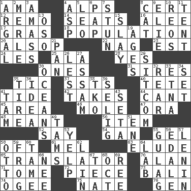 ACROSS 1. Nanny (var.) 4. High mountains 8. An absolute certainty 12. San ____ (Riviera town) 14. Theater features 16. Toward shelter 17. Pate de foie ____ 18. Census information 20. Columnist Joseph or Stewart 22. Tired old horse 23. Eastern Standard Time (abbr.) 24. French article 25. Wing 28. It is so 30. Washington bills 31. Begets 35. Nervous spasm 37. Fast planes 40. Wig 41. Periodic rise and fall of the sea level 42. Proceeds 44. Patter 45. Length times width 46. Undercover agent 47. Mouth or opening 48. Intended 50. A whole individual unit 52. Declare 54. Separate the seeds from cotton 55. Set 58. Often (poetically) 61. Cartoonist voice _ Blanc 63. Evade 65. Interpreter 70. Actor Alda or Thicke 71. Heavy book 72. Component 73. Indonesian resort city 74. Double curve, resembling the letter S 75. Nathan's nickname 76. Commissioned mil. rank DOWN 1. Therefore, facetiously 2. Haggard of country music 3. Collect or gather 4. Cleo's killer 5. Lion 6. Infant food 7. Make senseless or dizzy 8. Feline 9. Writer Wiesel 10. Vintage cars 11. Portable shelter 13. Bear (Spanish) 15. Kill 19. Matures 21. Baking dish 26. For fear that 27. Indian state 29. "Cheers" or "Ellen" 30. Seas 32. Posterior 33. Inactive volcano in Sicily 34. Arrange properly for use 35. Hoop that covers a wheel 36. It may be bright or harebrained 38. Ring climax 39. Major League Baseball Commissioner Bud 41. Scottish cap 43. Stalk of a moss capsule 49. Scottish caps 51. Compass dir. 53. Sharp bark 55. POW camp 56. Peak District village in England 57. Soviet premier 1918-24 58. Von Bismarck 59. Toadlike animal 60. Docile 62. (Had) reclined 64. Experiment locale 66. Born 67. Beverage made from leaves 68. Sep. follower 69. To separate or throw off