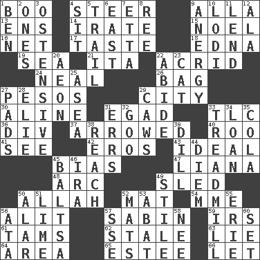 ACROSS 1. Surprise greeting 4. Navigate 9. Silent film actress Nazimova 13. Followers of ems 14. Feeling or showing extreme anger 15. Christmas carol 16. Fish or hair follower 17. Clothes sense 18. Pulitzer Prize-winning author Ferber 19. Ocean 21. Call ___ day 22. Sour-tasting 24. Anneal 26. Paper or plastic container 27. Mexican monetary units 29. Municipality 30. Place in a line 31. Mild oath 33. Affectionate concern, for short 36. HTML Container Element 37. Moved like an arrow 40. Friend of Pooh 41. Perceive with the eye 42. Greek god of love 43. Perfect 45. Prejudice 47. Climbing, woody, usually tropical vines 48. Curve 49. Downhill vehicle 50. Assad's deity 52. Floor protector 54. Madame (abbr.) 56. Set down 57. Unit of acoustic absorption 59. Big collection agency 61. Scottish caps 62. Showing deterioration from age 63. Whopper 64. Length times width 65. First name in cosmetics 66. Allow DOWN 1. Benjamin's nick name 2. Singles 3. Clearly or manifestly demonstrative 4. Be seated 5. Get behind 6. 90 degrees 7. Singer James 8. To sift 9. Disorder of the immune system 10. Farming town in central California 11. Grant temporary use of 12. Wing 20. A really long time 22. Tolerate 23. Domesticated feline 25. Toward the sea 27. Writing tablets 28. Writer Wiesel 29. Crow sounds 31. Blunders 32. Thick or sticky substance 33. Excercise machine 34. Grant temporary use of 35. Root beer relative 38. Arrive at 39. Deli pickle 44. South Vietnam president (1954) 45. Greek mezzo-soprano Agnes 46. Retirement account (abbr.) 49. Vertical member of a panel or frame 50. Having or resembling wings 51. Citrus frut 52. Floor protectors 53. Blind as ____ 55. 4th largest of the Great Lakes 56. "One Day ___ Time" 57. Compass dir. 58. Born 60. Put into a specified state