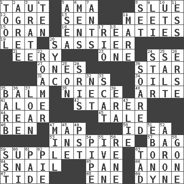 ACROSS 1. Drawn tight 5. Nanny (var.) 8. Turn sharply 12. Legendary monster 13. Elected rep. 14. Confronts 15. Northwest Algerian city 16. Pleas 19. Allow 20. More lively and spirited 21. Suggestive of the supernatural 23. Single 24. Compass dir. 27. Singles 30. Play the lead 31. Oak nuts 34. Petroleums 35. Lip ointment 38. Sibling's daughter 40. Johnson of "Laugh-In" 41. _ vera 42. A viewer who gazes fixedly 44. Tail end 45. Story 46. Benjamin's nick name 47. Atlas unit 50. The content of cognition 53. Heighten or intensify 57. Container for groceries 59. Supplying deficiencies 63. "Corrida" creature 64. Slow-paced one 65. Baking dish 66. Soon (poet.) 67. Event that recurs at intervals 68. Compass dir. 69. Unit of force DOWN 1. Instrument 2. Match 3. A salt of uric acid 4. Nine, plus one 5. At sea 6. Not women's 7. Pismires 8. Arrange properly for use 9. Luau accessory 10. Shoshoni 11. Double-curved letter 14. Female horse 17. River (Sp.) 18. Car or cant ending 20. Synchronize (abbr.) 22. Wanderer 24. Commotion 25. Table seasoning 26. Celtic language 28. A really long time 29. Indian titles of respect 30. Flew 32. Fish or hair follower 33. Scram, to a cat 35. Sharp remark 36. Toward shelter 37. Grant temporary use of 39. Period 43. Writer Wiesel 47. Place where flour is made 48. One (Scot) 49. Pacific Standard Time (abbr.) 51. Black 52. Composer Copland 54. Corncob 55. "Terrible" tsar 56. French philosopher Descartes 58. Went 59. Fast jet (abbr.) 60. Corn or form start 61. Groovy apt. 62. Sliced dessert 63. Small amount or degree