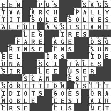 ACROSS 1. Car or cant ending 4. Product of festering 7. Droops 11. Federal power corp. 12. Bowlike part 13. Friendly 14. Teat (slang) 15. Flatfish 16. Finds the solution 17. Native American of Southwest Alaska 19. Aide 21. Part of a journey 23. Angers 24. Conductor's collection 25. Grow older 26. Bear (Spanish) 29. Wash lightly 30. Followers of ems 31. Player for Phoenix 32. Snakelike fish 33. Big collection agency 34. Binary compound 35. Heredity factor (abbr.) 36. _-fi 37. Stories 40. Title for a knight 41. Area sheltered from the wind 42. One who makes use of a thing 43. Skim 45. Eastern Standard Time (abbr.) 46. Casting lots 51. Small island 55. Foolish or stupid persons 56. Travels 58. Mouth or opening 59. Impressive in appearance 60. For fear that 61. Wind 62. Celtic language 63. Raised railways 64. Remaining after all deductions DOWN 1. Singer James 2. Tending to cause great harm 3. Nathan's nickname 4. Adept person 5. Southern CA. univ. 6. "______ My Girl" (Turtles hit) 7. Table seasonings 8. Inventor's middle name 9. Small, secluded valley 10. System (abbr.) 12. Michaelmas daisies 13. Introduce or present, as a question 16. Fathers 18. Uhlan (variant) 20. Public displays of written messages 22. Unit of force equal to gravity 24. Having threads 25. Nest on high 26. Flexible twig of a willow tree 27. Soap bubbles 28. Single 29. Painter Guido (1575-1642) 32. Begley and Asner 33. Ancient Celtic tribe of eastern Britain 36. Narrow boards 37. Third day of the wk. 38. Aid 39. Allows 43. Fur scarf 44. Quote 46. Trig term 47. Aroma 48. Teases 49. Stare 50. Christmas carol 52. Grant temporary use of 53. 4th largest of the Great Lakes 54. Small pie 57. Curvy letter