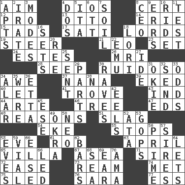 ACROSS 1. Direct toward a target or goal 4. "Vaya con ____" 8. An absolute certainty 12. Adept person 13. "Beetle Bailey" pooch 14. 4th largest of the Great Lakes 15. Bits 17. Suttee (variant) 18. Titled peers of a realm 19. Guide 21. Lion 23. Arrange properly for use 24. _____ Park, CO 26. Medical imaging device (abbr.) 28. Ooze 30. Boisterous (Brazilian Portuguese) 34. Deep reverence 37. Grandmother 39. Made supply last 40. Allow 41. Collection of objects 43. Indiana (abbr.) 44. Johnson of "Laugh-In" 46. Relationship diagram 47. Begley and Asner 48. Thinks logically 51. Volcanic refuse 54. Supplement with great effort 55. Obstructs or blocks passage 58. Night before a holiday 61. Director Reiner 63. Showery time 65. Country estate 67. At sea 71. The founder of a family 72. Relaxation 73. 480, 500 or 516 sheets of paper 74. Was introduced to 75. Downhill vehicle 76. "Two Mules for Sister ____" 77. Curvy letter DOWN 1. Flats, for short 2. Feeling or showing extreme anger 3. Methods 4. Two (Sp.) 5. Call ___ day 6. Baseball player Mel 7. The visible part of the earth's surface 8. Corporate head (abbr.) 9. Blunders 10. Travel on an animal 11. Trial 16. Puts into a specified state 18. Australian parrot (variant) 20. To separate or throw off 22. Australian flightless bird 25. Posted 27. Binary compound 29. Pieces 30. All-night dance parties 31. Migrant worker of the '30s 32. Post 33. Likelihood 34. Having or resembling wings 35. Past tense of be (plural) 36. Singer James 38. Not either 42. Snakelike fish 45. Compass dir. 49. Gumbo ingredient 50. Modern: prefix 52. _ moment's notice (2 wds.) 53. Republicans 56. First class 57. Fathers 58. Nights before holidays 59. Small bottle 60. Otherwise 62. Taverns 64. Allows 66. Directed 68. Ocean 69. Ewer handle 70. Nursemaid (var.)