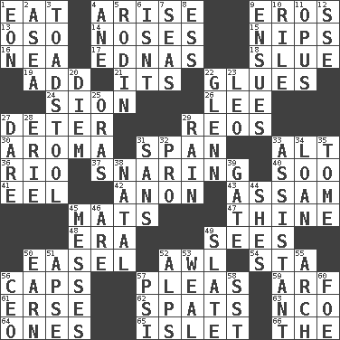 ACROSS 1. Erode 4. Ascend 9. Greek god of love 13. Bear (Spanish) 14. Olfactory organs 15. Cuts off 16. Teachers' org. 17. Ferber et al. 18. Turn sharply 19. Find the sum of 21. ___ a Wonderful Life 22. Cements 24. The Jewish people; Israel 26. Area sheltered from the wind 27. Prevent from occurring 29. Vintage cars 30. Scent 31. Connect, as a bridge 33. The first octave above the treble staff 36. _ de Janeiro 37. Catching in a trap 40. "Barney Miller" actor Jack 41. Snakelike fish 42. At once, immediately (arch.) 43. Indian state 45. Floor protectors 47. One or ones belonging to thee 48. Epoch 49. Observes 50. Artist's stand 52. Leather borer 54. R.R. building 56. Balmoral and tarboosh 57. Entreaties 59. Sandy's bark 61. Celtic language 62. Arguments over trivial matters 63. Non-commissioned officer (abbr.) 64. Singles 65. Small island 66. Definite Article DOWN 1. A really long time 2. Toward the sea 3. Inedible or poisonous agaric 4. One (Scot) 5. "The Thinker" sculptor 6. Is not 7. Oceans 8. Double-curved letter 9. Follows as a consequence or result 10. Cause heat under the collar 11. Musical composition 12. Compass dir. 20. South Vietnam president (1954) 22. American astronaut and politician John 23. Lion 25. Mouths or openings 27. Have the gumption 28. 4th largest of the Great Lakes 29. Water falling in drops from the sky 31. Without 32. Adept person 33. Helper 34. Grant temporary use of 35. Heavy book 38. Brizilian seaport 39. Yard entry 44. "______ My Girl" (Turtles hit) 45. Makes clutter 46. "We ___ not amused" (Victoria) 49. Schedule 50. Merit 51. Domed church section 52. High mountains 53. Welt 55. Bowlike part 56. Corporate head (abbr.) 57. 23rd letter of the Greek alphabet 58. Fast jet (abbr.) 60. Enemy