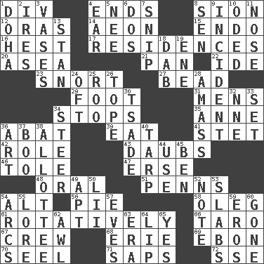 ACROSS 1. HTML Container Element 4. Extremities 8. The Jewish people; Israel 12. Mouths or openings 14. Period of immesurable duration 15. Inside; within (prefix) 16. Command 17. Dwellings 20. At sea 21. Baking dish 22. Binary compound 23. Derisive sound 27. Necklace unit 29. 12 inches 31. Not women's 34. Ceases 35. Singer Murray 36. Blind as ____ 39. Ingest 41. Proofreading order 42. Hero or heavy, e.g. 43. Applies to a surface 46. Lacquered or enameled metalware 47. Celtic language 48. Relating to the mouth 51. Actor Sean's family 54. Keyboard modifier key 56. Sliced dessert 58. Cassini of fashion 61. Happening in regular succession 66. Edible starchy tuberous root 67. Ship's personnel 68. One of the Great Lakes 69. Inky black, to poets 70. Sew up the eyelids of hawks and falcons 71. Plant excrements 72. Compass dir. DOWN 1. Capital of the state of Qatar 2. Angers 3. Flower holders 4. Ewer handle 5. Born 6. Two (Sp.) 7. Clip 8. Elected rep. 9. Event 10. Wrote a lyric poem 11. Characteristic smell of wine 13. Comedian Laurel of Laurel & Hardy 18. Pat or tap gently 19. Compass dir. 24. Often (poetically) 25. Friend of Pooh 26. Drink excessively 28. Collect or gather 30. Sadhe (variant) 32. Compass dir. 33. Put into a specified state 34. Bull 36. Tate display 37. Sometimes accompanies a hiss 38. One to whom something is allotted 40. Canvas cover 44. Purpose 45. Benjamin's nick name 49. Fitting 50. Cards in a Roman deck? 52. Make mention of 53. Thick slices 54. Curves 55. Old wives' tales, e.g. 57. Nights before holidays 59. Greek god of love 60. Went 62. Leather borer 63. Epoch 64. Mouth edge 65. It is so