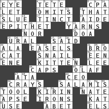 ACROSS 1. Sight organ 4. False hair 8. Numbers guy (abbr.) 11. Allow 12. Leaves out 14. Not this but _ 15. Change direction abruptly 17. Tinged 18. Helper 19. Curse 21. Entertaining tales 23. And not 24. ___ good deed 25. Mountain range 27. Expressed in words 30. Insect wing 31. Artist's stands 34. Sis' sibling 37. Feline 38. Slow-paced one 39. Car or cant ending 40. Compass dir. 41. Baby cat 43. Area sheltered from the wind 44. Balmoral and tarboosh 45. Norwegian king 47. _ moment's notice (2 wds.) 49. Corporate head (abbr.) 50. Trading vessels 52. Deli grouping 56. Instrument 57. Japanese brewing company 60. Nathan's nickname 61. Domed church section 62. Removes the wrinkles 63. Krazy ___ of comics 64. Purpose 65. Collude with 66. Raised railways DOWN 1. Otherwise 2. Sharp bark 3. Needle holder 4. Carrier 5. Give off 6. Shallow baking pan 7. And so on (abbr.) 8. Large country 9. Writing tablets 10. Had dinner 13. Filthy place 14. Pacific island yam 16. Inactive volcano in Sicily 20. Hollow 22. Increase 25. ____ Bator, Mongolia 26. Pace 27. Theater features 28. Came down and settled, as after flight 29. Small island 30. Adept person 32. "____ silly question..." 33. Sever or remove by pinching or nipping 34. Actor Lugosi 35. Coral collection 36. Single 42. Christmas carol 44. Island 46. Grant temporary use of 47. Came up 48. Story 49. 2nd pers. sing. pres. of can (arch.) 50. 911 reaches them 51. What Jean-Claude Killy likes to do 52. Trig term 53. Cause to be 54. Slanted text style (abbr.) 55. Arranges properly for use 56. The 19th letter of the Greek alphabet 58. Retirement account (abbr.) 59. Director Reiner