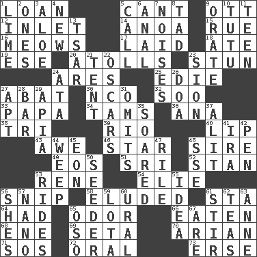 ACROSS 1. Grant temporary use of 5. Patter 9. Baseball player Mel 12. An arm off of a larger body of water 14. Small Philippine buffalo 15. Regret 16. Catcalls? 17. Put down 18. Had dinner 19. Compass dir. 20. Ringlike coral islands and reefs 23. Surprise greatly 24. Ancient Greek god of war 25. Singer Brickell 27. Blind as ____ 30. Non-commissioned officer (abbr.) 32. "Barney Miller" actor Jack 33. Dad 34. Scottish caps 36. Santa ___, CA 38. Three (prefix) 39. _ de Janeiro 40. Mouth edge 43. Deep reverence 46. Play the lead 48. Beget 49. Greek goddess of the dawn 51. Indian title of respect (Mr.) 52. Comedian Laurel of Laurel & Hardy 53. French philosopher Descartes 54. Writer Wiesel 56. Sever or remove by pinching or nipping 58. Dodged 61. R.R. building 64. Possessed 65. Aroma 66. Consumed 68. Compass dir. 69. Bristle 70. Believer in; advocate of (suffix) 71. Mayday 72. Relating to the mouth 73. Celtic language DOWN 1. Citrus frut 2. Singles 3. Medicinal plant 4. ___ Haven, CT 5. Give a ring to 6. Of or related to the anus 7. Annoying sounds 8. Small boy 9. Declaim 10. Ballerina skirt 11. Adolescent 13. Russian ruler of old 21. Portable shelter 22. Motion picture awards 23. The Jewish people; Israel 24. _ moment's notice (2 wds.) 26. ___ good deed 27. Fitting 28. Oblong piece of solid material 29. Capital of Western Samoa 31. Leaves out 35. Flew 37. Set down 41. Retirement account (abbr.) 42. Animal enclosure 44. Shed a tear 45. Period of immesurable duration 47. Cause heat under the collar 48. Compass dir. 50. Sowing specialist 53. Amusement-park features 55. The main thing one is thinking about 56. "______ My Girl" (Turtles hit) 57. Billionth: prefix 59. Globular water bottle used in Asia 60. Mountain range 61. Tumult 62. Afternoon social gatherings 63. Queen of England 1702-14 65. Bear (Spanish) 67. "We ___ not amused" (Victoria)
