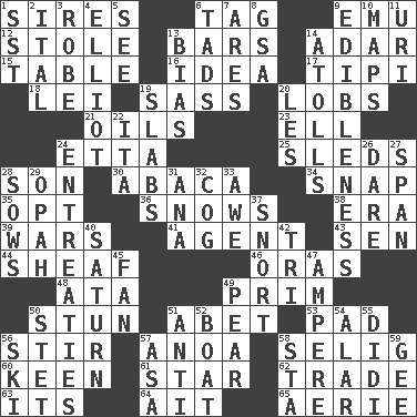 ACROSS 1. Fathers 6. Label 9. Australian flightless bird 12. Took without asking 13. Taverns 14. The sixth month of the Jewish calendar 15. Eating place 16. The main thing one is thinking about 17. Native american tent (variation) 18. Luau accessory 19. Backtalk 20. Tennis shots 21. Lubricates 23. Pipe bend 24. Singer James 25. Bobsleighs 28. Boy, to dad 30. Phillipine bananalike plant 34. Fastener 35. Choose 36. Overwhelms 38. Epoch 39. Armed conflicts 41. Rep 43. Elected rep. 44. Archer's quiver 46. Mouths or openings 48. "One Day ___ Time" 49. Demure 50. Surprise greatly 51. Collude with 53. Groovy apt. 56. Move through with a circular motion 57. Small Philippine buffalo 58. Major League Baseball Commissioner Bud 60. Peachy ____! 61. Play the lead 62. Exchange 63. It is 64. Small island 65. Nest on high DOWN 1. Fast jet (abbr.) 2. Slanted text style (abbr.) 3. Loose flowing garment 4. American author Paul (1891-1958) 5. Observe 6. Small amounts or degrees 7. Ancient Greek god of war 8. Girls' org. (abbr.) 9. The property of being fit to eat 10. Atlas contents 11. RI univ. 13. Prejudice 14. Ringlike coral islands and reefs 19. Broad, flat, thick pieces 20. French article 22. Call ___ day 24. Pleas 26. Have the gumption 27. Connect, as a bridge 28. Sty mamas 29. Brightly colored fish 31. Santa ___, CA 32. Gear tooth 33. Deep reverence 37. Derisive sound 40. Titan orbits this 42. Three (prefix) 45. Air blower 47. Electrical Unit 49. Lightbulb-shaped fruit 50. Proofreading order 51. Against 52. Water vessel 54. Having or resembling wings 55. "You Light Up My Life" star Conn 56. What Jean-Claude Killy likes to do 57. White ___ sheet 58. R.R. building 59. Turn to the right