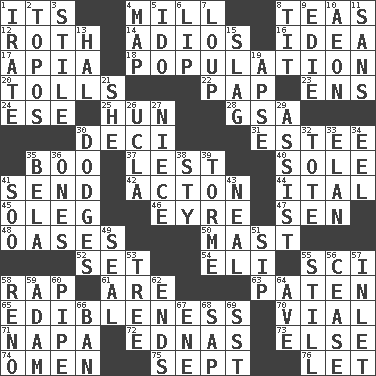ACROSS 1. It is 4. Place where flour is made 8. Beverages made from leaves 12. Writer of Portnoy's Complaint (1969) 14. Goodbye (Sp.) 16. The main thing one is thinking about 17. Capital of Western Samoa 18. Census information 20. For Whom the Bell _____ 22. Infant food 23. Followers of ems 24. Compass dir. 25. Attila the _ 28. Girls' org. (abbr.) 30. Tenth: prefix 31. First name in cosmetics 35. Oct. 31 cry 37. For fear that 40. Not divided or shared with others 41. Transmit 42. NE Massachussets city 44. Slanted text style (abbr.) 45. Cassini of fashion 46. Jane of fiction 47. Elected rep. 48. Fertile tracts in a desert 50. Vertical spar for supporting sails 52. Arrange properly for use 54. Biblical high priest 55. _-fi 58. Reproach for some lapse or misdeed 61. "We ___ not amused" (Victoria) 63. Eucharist need 65. The property of being fit to eat 70. Small bottle 71. California wine valley 72. Ferber et al. 73. Otherwise 74. Presage 75. Back-to-school mo. 76. Allow DOWN 1. Feeling or showing extreme anger 2. Traditional theme or motif 3. Vertical member of a panel or frame 4. Atlas unit 5. Wedding promise 6. Mouth edge 7. Central Nebraska county 8. Teat (slang) 9. Singer Brickell 10. A really long time 11. Without 13. Actor Linden 15. Volcanic refuse 19. Domed church section 21. A female animal or person 26. Southern CA. univ. 27. Sibling's daughter 29. Aid 30. Evades 32. Haul 33. Style 34. Snakelike fish 35. Actor Lugosi 36. Singles 38. Filthy place 39. Singer Mel 41. "Barney Miller" actor Jack 43. Be tempered by heat 49. Lick closed 51. Small drink 53. Family _ (genealogy) 55. Free from disturbance or agitation 56. Stop 57. An arm off of a larger body of water 58. Former U.S. Attorney General Janet 59. First man 60. Corncob 62. Conclusions 64. "___ Maria" 66. Forbid 67. Compass dir. 68. Plant excrement 69. Fast jet (abbr.)