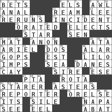 ACROSS 1. Stakes 5. Raised railways 8. Leather borer 11. Of or related to the anus 12. 480, 500 or 516 sheets of paper 13. Area sheltered from the wind 14. Summer TV shows 17. Happening 19. Spoke pompously 21. Chooses 22. Play the lead 23. Elected rep. 24. Floor covering 27. Soon (poet.) 29. "One Day ___ Time" 32. Satellite of Uranus 34. Two (Sp.) 36. Having or resembling wings 37. Republicans 38. Eastern Standard Time (abbr.) 39. _ and Stitch 40. Naughty children 41. Ocean 42. Natives or inhabitants of Denmark 43. Island 44. Father 46. Compass dir. 47. Parent Teacher Assoc. 50. Roll call or roster of names 52. A viewer who gazes fixedly 55. Michaelmas daisies 57. Newsperson 59. Threatening words 62. It is 63. Filth; sediment 64. California wine valley 65. Observe 66. Snakelike fish 67. Blind as ____ DOWN 1. Drinking establishment 2. Compass dir. 3. Edible starchy tuberous root 4. Disparaging remarks 5. Car or cant ending 6. Shoestrings 7. Grin 8. Actor Baldwin 9. Left 10. Allows 12. To free from 15. Brizilian seaport 16. Comedian Laurel of Laurel & Hardy 18. Lair 20. Eats (away) 24. Mysterious quality of enchantment 25. Scent 26. Likely to tip or tilt 28. Olfactory organs 29. Place in a line 30. Lies 31. Came up 33. Curvy letter 35. Flight of steps 36. In the manner of 42. Prevent from occurring 45. Printing process, for short 47. Adept person 48. Laconic 49. Nick name for Arthur 51. Sports stadium 52. Indian titles of respect 53. Wig 54. Domed church section 55. "We ___ not amused" (Victoria) 56. Thick slice 58. Pipe bend 60. Health resort 61. Consume