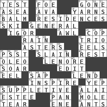 ACROSS 1. Trial 5. Enemy 8. Went 12. At sea 13. Actress Gardner 14. Tall tales 15. Lip ointment 16. Dwellings 19. What Jean-Claude Killy likes to do 20. Commissioned military rank 21. Composer Stravinsky 23. Leather borer 24. Police officer (slang) 27. Precipitation 30. Musical group of three 31. Michaelmas daisies 34. Snakelike fish 35. Inconspicuous attention getter 38. Killed 40. Take ten 41. Margarine 42. Poe poem 44. Fly high 45. Prepare for publication 46. Snakelike fish 47. Plant excrement 50. Grant temporary use of 53. Stimulate to action 57. Slangy assent 59. Supplementary 63. Jai ____ 64. First name in cosmetics 65. Baking dish 66. Undercover agent 67. Pull apart 68. Compass dir. 69. Pismires DOWN 1. Bar bills 2. 1973 Nobel Price Winner (Physics) Leo 3. Former Milwaukee Brewers owner Bud 4. Scottish cap 5. Conductor's collection 6. Baking chamber 7. Comfort 8. Separate the seeds from cotton 9. The grampus (Milton) 10. Compass dir. 11. Curvy letter 14. Shout 17. Lyricist Gershwin 18. Simpleton 20. Pate de foie ____ 22. Speaker 24. Algonquian 25. Petroleums 26. Mail 28. ___ a Wonderful Life 29. 1994 drama film starring Jodie Foster 30. Cylindrical with tapered ends 32. Actress Charlotte 33. Trig term 35. Introduce or present, as a question 36. _ gin 37. Lick closed 39. Lower and raise head in agreement 43. Cause heat under the collar 47. Filth; sediment 48. One (Scot) 49. Pacific Standard Time (abbr.) 51. Thermoplastic polyamide 52. Started a card game 54. Corncob 55. "Terrible" tsar 56. French philosopher Descartes 58. Sliced desserts 59. Arrange properly for use 60. Purpose 61. Parent Teacher Association (abbr.) 62. For each 63. Nanny (var.)