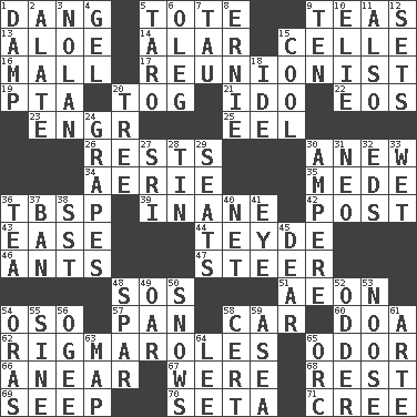 ACROSS 1. Mild oath, euphamism for damn 5. Haul 9. Beverages made from leaves 13. _ vera 14. Having or resembling wings 15. Cell (Danish) 16. Shopping center 17. One who advocates reunion 19. Parent Teacher Association (abbr.) 20. Coat; cloak 21. Wedding promise 22. Greek goddess of the dawn 23. Engineer (abbr.) 25. Snakelike fish 26. Musical pauses 30. Afresh 34. Nest on high 35. Ancient Persian 36. Cook's measure (abbr.) 39. Lacking in sense or substance 42. Mail 43. Relaxation 44. Miss Universe 1986, Barbara Palacios _ 46. Pismires 47. Bull 48. Mayday 51. Period of immesurable duration 54. Bear (Spanish) 57. Baking dish 58. Auto 60. ___ good deed 62. Complicated, petty procedures 65. Aroma 66. Approach 67. We are 68. Respite 69. Ooze 70. Stalk of a moss capsule 71. Algonquian DOWN 1. Moist 2. Having winglike extensions 3. Pitcher Ryan 4. Set 5. Pacific island yam 6. Cassini of fashion 7. The 19th letter of the Greek alphabet 8. Bert's buddy 9. "___ Little Indians" 10. Writer Wiesel 11. In addition 12. Puts into a specified state 15. Calm and collected 18. Binary compound 20. Family _ (genealogy) 24. Wine fruits 27. _ Lanka 28. Metal container 29. Theater features 30. Electrical Unit 31. Modern: prefix 32. Begley and Asner 33. Soggy 36. Beverage made from leaves 37. Prohibit 38. Fast jet (abbr.) 40. Fish or hair follower 41. Sight organ 45. Letter starter 48. Coast Guard woman 49. Boat paddle 50. Overwhelms 52. More peculiar 53. Trap for birds or small mammals 54. Mouths or openings 55. Trig term 56. Double curve, resembling the letter S 58. Certainty 59. At sea 61. Johnson of "Laugh-In" 63. Atlas unit 64. Area sheltered from the wind 65. The grampus (Milton)