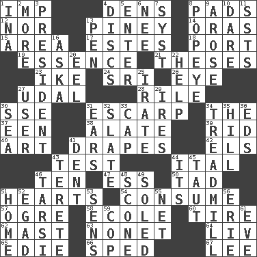ACROSS 1. Mischievous child 4. Hiding places for outlaws 8. Groovy apts. 12. And not 13. Abounding in pines 14. Mouths or openings 15. Type of rug 17. _____ Park, CO 18. Sweet dark-red dessert wine 19. Gist 21. College papers 23. Mamie's husband 24. _ Lanka 26. Sight organ 27. Freehold land 28. Cause heat under the collar 30. Compass dir. 31. Fortification 34. Definite Article 37. Car or cant ending 38. Having winglike extensions 39. To free from 40. Nonscientific branch of learning 41. Window treatments 42. Raised railways 43. Trial 44. Slanted text style (abbr.) 46. "___ Little Indians" 47. Curvy letter 50. Bit 51. Centers of feelings and intuitions 54. Ingest 57. Legendary monster 58. Learning spot: Fr. 60. Become fatigued 62. Vertical spar for supporting sails 63. Music written for nine 64. 54 in ancient Rome 65. Singer Brickell 66. Moved rapidly 67. Area sheltered from the wind DOWN 1. _ tizzy (2 wds.) 2. Greater amount 3. Elected leader of a country 4. Plates 5. Keyboard key 6. Born 7. System (abbr.) 8. Wimpy's pal 9. Came up 10. Have the gumption 11. Fast planes 13. Writing instrument 16. "____ silly question..." 20. Snakelike fish 22. Aid 25. Feeling or showing extreme anger 27. One who uses or employs something 29. Angers 30. Ocean 31. Hearing organs 32. Schedule 33. Head covering 34. Excercise machine 35. Land elevation 36. Begley and Asner 41. Undesirable depression on a surface 43. Cylindrical with tapered ends 44. It is 45. Strained 46. Tarsus (plural) 48. Biscuitlike quick bread 49. Having a sole or soles 51. Residence 52. Mild oath 53. Elected reps. 55. Remaining after all deductions 56. One of the Great Lakes 59. Police officer (slang) 61. Night before a holiday