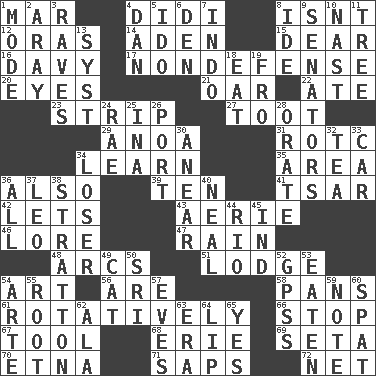ACROSS 1. Third mo. 4. "You Light Up My Life" star Conn 8. Is not 12. Mouths or openings 14. An important port of Yemen 15. Letter starter 16. American folk hero Crockett 17. Unrelated to defense, as in spending 20. Sight organs 21. Boat paddle 22. Had dinner 23. Empty completely 27. A blast of a horn 29. Small Philippine buffalo 31. College mil. group 34. Memorize 35. Length times width 36. In addition 39. Nine, plus one 41. Russian ruler of old 42. Allows 43. Nest on high 46. Old wives' tales, e.g. 47. Water falling in drops from the sky 48. Curves 51. Cabin 54. Tate display 56. "We ___ not amused" (Victoria) 58. Baking dishes 61. Rotating or pertaining to rotation 66. Discontinue 67. Utensil 68. One of the Great Lakes 69. Stalk of a moss capsule 70. Inactive volcano in Sicily 71. Plant excrements 72. Fish or hair follower DOWN 1. Method 2. Like ___ of sunshine 3. All-night dance parties 4. Daniel's nick name 5. Wedding promise 6. Lair 7. _ china 8. Binary compound 9. Elected representatives 10. Political cartoonist Thomas 11. Relationship diagram 13. System (abbr.) 18. Erode 19. From 24. Actress Charlotte 25. _ tizzy (2 wds.) 26. Sweet dark-red dessert wine 28. Speak pompously 30. Approach 32. Afternoon social gathering 33. 4-wheeled motor vehicle 34. Failure 36. Everything 37. Lion 38. Ski resort town in Vermont 40. Actress Patricia 44. River (Sp.) 45. Working for oneself (abbr.) 49. Domesticated feline 50. Indian title of respect (Mr.) 52. Global Positioning Systems (abbr.) 53. Consumed 54. Johnson of "Laugh-In" 55. Carrot, for example 57. Nights before holidays 59. Observe 60. Petty quarrel 62. In the manner of 63. Period 64. Mouth edge 65. It is so
