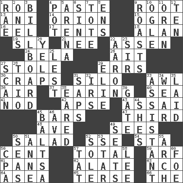 ACROSS 1. Director Reiner 4. Thick mixture 9. Carrot, for example 13. Cuckoo 14. Constellation of myth 15. Legendary monster 16. Snakelike fish 17. Portable shelters 18. ____ Jay Lerner 19. Wily 21. Born 22. NE Netherlands city 24. Actor Lugosi 26. Small island 27. Took without asking 29. Blunders 30. Dice game 31. Grain storage tower 33. Leather borer 36. Wind 37. Lacerating 40. Ocean 41. Lower and raise head in agreement 42. Domed church section 43. Slender Brazilian palm 45. Soap units 47. One of three equal parts 48. "___ Maria" 49. Observes 50. Vegetable dish 52. Compass dir. 54. R.R. building 56. Penny 57. Add up to 59. Sandy's bark 61. Zero-star reviews 62. Having winglike extensions 63. Non-commissioned officer (abbr.) 64. At sea 65. Laconic 66. Definite Article DOWN 1. Actress Charlotte 2. Singles 3. Big road sign 4. Plant holder 5. Sports stadium 6. Trig term 7. Carry 8. Followers of ems 9. Ridicules or criticizes harshly 10. Stare 11. Northwest Algerian city 12. "___ Little Indians" 20. Sharp bark 22. Composer Copland 23. Title for a knight 25. For fear that 27. Examine minutely or intensely 28. Musical group of three 29. Writer Wiesel 31. Plant excrements 32. Big collection agency 33. Helper 34. Erode 35. Put down 38. Having ears or earlike features 39. Yard entry 44. "______ My Girl" (Turtles hit) 45. Greek mezzo-soprano Agnes 46. Actress Gardner 49. Theater features 50. Oceans 51. Queen of England 1702-14 52. Flatfish 53. Play the lead 55. Bowlike part 56. Numbers guy (abbr.) 57. Make lace 58. Area sheltered from the wind 60. Enemy