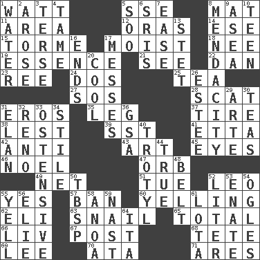 ACROSS 1. Electrical Unit 5. Compass dir. 8. Floor protector 11. Type of rug 12. Mouths or openings 14. Compass dir. 15. Singer Mel 17. Wet 18. Born 19. Core 21. Perceive with the eye 22. One of the 12 tribes of Israel 23. To separate or throw off 24. Two (Sp.) 25. Afternoon social gathering 27. Mayday 28. Get outta here! 31. Greek god of love 35. Part of a journey 37. Become fatigued 38. For fear that 39. Fast jet (abbr.) 41. Singer James 42. Opposed to 43. Nonscientific branch of learning 45. Snake ____ (dice throw) 46. Christmas carol 47. Globe 49. Fish or hair follower 51. Third day of the wk. 52. Lion 55. Consenting reply 57. Forbid 60. Crying or shouting loudly 62. Connecticut Ivy Leaguer 63. Slow-paced one 65. Add up to 66. 54 in ancient Rome 67. Mail 68. Wig 69. Area sheltered from the wind 70. "One Day ___ Time" 71. Ancient Greek god of war DOWN 1. Wetness 2. Came up 3. Laconic 4. Docile 5. "Barney Miller" actor Jack 6. Indian titles of respect 7. Comfort 8. Ananias' fault 9. At sea 10. Adolescent 13. Proofreading order 16. Extremities 17. Makes clutter 20. Calm and collected 26. First name in cosmetics 29. Johnson of "Laugh-In" 30. Afternoon social gatherings 31. Enthusiasm 32. Former U.S. Attorney General Janet 33. Clearly or manifestly demonstrative 34. Vertical member of a panel or frame 36. Girls' org. (abbr.) 40. TNT 44. Loyal 48. Waist strap 50. Cook's measure (abbr.) 52. 61 cubic inches 53. Related on the mother's side 54. Stares at amorously 55. Shout 56. Writer Wiesel 58. Small Philippine buffalo 59. Political cartoonist Thomas 61. Globular water bottle used in Asia 64. Call ___ day