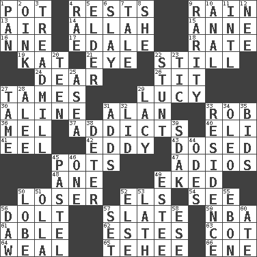 ACROSS 1. Plant holder 4. Musical pauses 9. Water falling in drops from the sky 13. Wind 14. Assad's deity 15. Singer Murray 16. Compass dir. 17. Peak District village in England 18. Assign a rank or rating to 19. Krazy ___ of comics 21. Sight organ 22. Not moving 24. Letter starter 26. Teat (slang) 27. Corrects by punishment or discipline 29. "I Love _" 30. Place in a line 31. Actor Alda or Thicke 33. Director Reiner 36. Cartoonist voice _ Blanc 37. Inveterate users 40. Biblical high priest 41. Snakelike fish 42. Whirlpool 43. Administered medicine 45. Cooking vessels 47. Goodbye (Sp.) 48. A saturated hydrocarbon 49. Made supply last 50. Failure 52. Raised railways 54. Observe 56. Stupid person 57. Schedule 59. Basketball assoc. 61. Competent 62. _____ Park, CO 63. Small bed 64. Welt 65. Giggle 66. Compass dir. DOWN 1. Baking dish 2. Pig sound 3. Excercise machine 4. Actress Charlotte 5. A person who is older than you are 6. Kill 7. Lie 8. A female animal or person 9. Noteworthy scarcity 10. Of or related to the anus 11. International (abbr.) 12. Born 20. Adolescent 22. Difficult or unusual or dangerous feat 23. Nervous spasm 25. Toward the sea 27. Docile 28. Toward shelter 29. Made of lace 31. Sums up 32. Flaplike covering 33. Dwelling 34. Margarine 35. Auction offers 38. Prevent from occurring 39. Neighbor of Neb. 44. Lyric poems 45. Soft color 46. Single 49. First name in cosmetics 50. Ear part 51. Water jar 52. Otherwise 53. Thin strip of wood or metal 55. Inky black, to poets 56. Obsolete 57. Arrange properly for use 58. Compass dir. 60. Had dinner