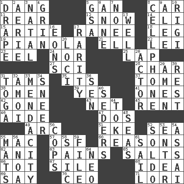 ACROSS 1. Mild oath, euphamism for damn 5. Separate the seeds from cotton 8. Auto 11. Bring up, as a child 12. Overwhelm 14. Connecticut Ivy Leaguer 15. Nick name for Arthur 17. Indian princess (variant) 18. Part of a journey 19. Player piano 21. Pipe bend 22. Flowery wreath 23. Snakelike fish 24. And not 25. Infant locale 27. _-fi 28. Burn to charcoal 31. Scottish caps 35. It is 37. Heavy book 38. Presage 39. Affirmative reply 41. Washington bills 42. Went 43. Remaining after all deductions 45. Monthly bill 46. Helper 47. Two (Sp.) 49. Curve 51. Supplement with great effort 52. Ocean 55. Big _ 57. Order of Saint Francis (abbr.) 60. Thinks logically 62. Black tropical American cuckoo 63. Aches 65. Table seasonings 66. Small child 67. Drop; flow; fall 68. The content of cognition 69. Declare 70. Corporate head (abbr.) 71. Australian parrot (variant) DOWN 1. Window treatment 2. Nest on high 3. Brizilian seaport 4. Smile widely 5. Girls' org. (abbr.) 6. Queen of England 1702-14 7. Christmas carol 8. Portable communications device 9. Toward shelter 10. Swiss mountan, "Queen of the Mountains" 13. Water source 16. Immeasurably long periods of time 17. Noteworthy scarcity 20. Venues 26. Thespian 29. So be it 30. Respite 31. Ancient Roman robe 32. Mine, in Marseilles 33. Ananias' fault 34. Scornful expression 36. Elected rep. 40. Spring feasts 44. Puff or smoke 48. Oceans 50. 911 reaches them 52. Twentieth part of a lira 53. Keyboard key 54. Slender Brazilian palm 55. Floor coverings 56. Small Philippine buffalo 58. Ketch in the Levant 59. Do some clerical work 61. Travel by water 64. Modern: prefix