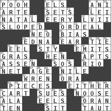 ACROSS 1. "Silly old bear" 5. Raised railways 8. Black tropical American cuckoo 11. Johnson of "Laugh-In" 12. Arranges properly for use 14. Luau accessory 15. Relating to or accompanying birth 17. Suggestive of the supernatural 18. 57 in ancient Rome 19. Inclined 21. Severe or trying experience 23. Modern: prefix 25. Prejudice 26. Pulitzer Prize-winning author Ferber 27. Hearing organ 28. Make a knot 31. Snakelike fish 33. Filthy place 35. Gives off 37. Pate de foie ____ 38. Layer 40. Flats, for short 41. NE Netherlands city 43. Distress signal 45. River (Sp.) 46. Remaining after all deductions 47. Ripen 50. The longest river in the world 52. Songbird 53. Mouth or opening 54. Components 56. One or the other of two 61. Haul 62. Takes to court 65. Trap for birds or small mammals 66. Chicken ___ king 67. Snakelike fish 68. NW Algerian seaport 69. "___ Little Indians" 70. Be seated 71. Drawn tight DOWN 1. Zero-star reviews 2. Spoken 3. "Beetle Bailey" pooch 4. Pile 5. Compass dir. 6. Area sheltered from the wind 7. Disco prop 8. Inventor's middle name 9. Famous astronaut Armstrong 10. One more than two 13. Damascus' land 16. Grant temporary use of 18. French article 20. Lairs 22. Have the gumption 24. Pledge 26. Otherwise 28. Native american tent (variation) 29. "Tell ____ the Marines!" 30. Double-curved letter 31. Celtic language 32. 90 degrees 34. It is so 36. Female horse 37. Separate the seeds from cotton 39. Words to Nanette 42. Drug cop 44. Male parent of an animal 48. Honkers 49. Takes place subsequently 51. (Had) reclined 52. Soggy 54. Light colored 55. SW Asia republic 57. A blast of a horn 58. Israeli folk dance 59. He sold his birthright 60. Monthly bill 61. Domesticated feline 63. Biblical high priest 64. Fast jet (abbr.)