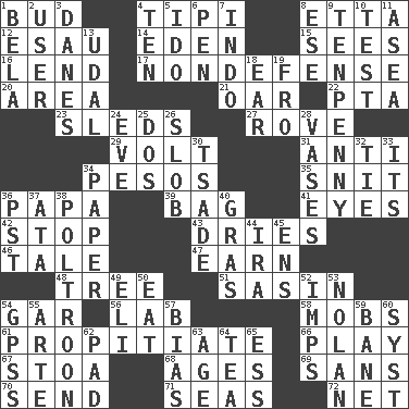 ACROSS 1. Partially opened flower 4. Native american tent (variation) 8. Singer James 12. He sold his birthright 14. Locale of original sin 15. Observes 16. Grant temporary use of 17. Unrelated to defense, as in spending 20. Type of rug 21. Boat paddle 22. Parent Teacher Assoc. 23. Bobsleighs 27. Be footloose 29. Electrical Unit 31. Opposed to 34. Mexican monetary units 35. In a ____ (agitated or irritated) 36. Dad 39. Container for groceries 41. Snake ____ (dice throw) 42. Halt 43. Frees from moisture 46. Falsehood 47. Merit 48. Relationship diagram 51. Indian antelope 54. Slender fish 56. Experiment locale 58. Crowds into 61. Appease 66. Shaw product 67. Portico 68. Ripens 69. Without 70. Transmit 71. Oceans 72. Fish or hair follower DOWN 1. Actor Lugosi 2. One who makes use of a thing 3. Natives or inhabitants of Denmark 4. Nine, plus one 5. Wedding promise 6. Animal enclosure 7. _ china 8. Compass dir. 9. 3-inch nail 10. Trial 11. Toward the sea 13. Allodial 18. Hearing organ 19. Away 24. Night before a holiday 25. Two (Sp.) 26. Messy guy 28. Flower holders 30. Sadhe (variant) 32. Standoff 33. ___ a Wonderful Life 34. Some stationery 36. Pacific Standard Time (abbr.) 37. _ moment's notice (2 wds.) 38. Characterized by complete cowardliness 40. Pate de foie ____ 44. Retirement account (abbr.) 45. Followers of ems 49. Connecticut Ivy Leaguer 50. Consume 52. Naughty children 53. Pitcher Ryan 54. Global Positioning Systems (abbr.) 55. Johnson of "Laugh-In" 57. Prejudice 59. Object of repulsion 60. System (abbr.) 62. Groovy apt. 63. Mature 64. Beverage made from leaves 65. Curvy letter