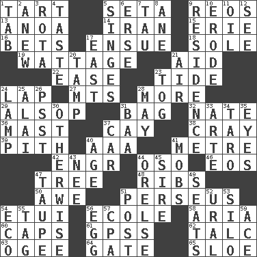 ACROSS 1. Small pie 5. Bristle 9. Vintage cars 13. Small Philippine buffalo 14. SW Asia republic 15. One of the Great Lakes 16. Wagers 17. Take place subsequently 18. Flatfish 19. Electrical Measurement 21. Help 22. Comfort 23. Event that recurs at intervals 24. Infant locale 27. Mountains (abbr.) 28. Greater amount 29. Columnist Joseph or Stewart 31. Paper or plastic container 32. Nathan's nickname 36. Vertical spar for supporting sails 37. Island 38. Supercomputer manufacturer 39. Essential or central part 40. American Automobile Association (abbr.) 41. Distance measurement (Brit.) 42. Engineer (abbr.) 44. Bear (Spanish) 46. Greek goddess of the dawn 47. Woody plant 48. Teases 50. Deep reverence 51. Son of Zeus who helped slay Medusa 54. Needle holder 56. Learning spot: Fr. 58. Operatic vocal solo 60. Smile enhancers 61. Global Positioning Systems (abbr.) 62. Baby powder 63. Double curve, resembling the letter S 64. Yard entry 65. _ gin DOWN 1. Bar bill 2. Afresh 3. Roll call or roster of names 4. Clothes sense 5. Burns superficially 6. Celtic language 7. The 19th letter of the Greek alphabet 8. One (Scot) 9. Dwelling 10. Wear away 11. Petroleum 12. Perceive with the eye 17. Compass direction 20. Pack (down) 21. Atmosphere 23. Coat; cloak 24. Desk light 25. Jai ____ 26. Inconspicuous attention getter 28. Fifth month 30. Else 31. Sound made by sheep 33. Johnson of "Laugh-In" 34. Pacific island yam 35. Snake ____ (dice throw) 37. Automobile 40. Ripen 41. Crowds into 43. Born 44. Threatening words 45. Beget 47. Grayish beige 49. Theater features 51. Mail 52. Mountain range 53. Grain storage tower 54. Environmental prefix 55. Label 56. Ovum 57. Numbers guy (abbr.) 59. Adept person