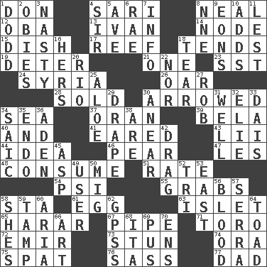 ACROSS 1. Spanish title 4. Indian skirt 8. Be tempered by heat 12. Chief or king in Benin or Nigeria 13. "Terrible" tsar 14. Thickened enlargement 15. Food container 17. Coral ridge 18. Watches over 19. Prevent from occurring 21. Single 23. Fast jet (abbr.) 24. Damascus' land 26. Boat paddle 28. Exchanged or delivered for money 30. Moved like an arrow 34. Ocean 37. NW Algerian seaport 39. Actor Lugosi 40. Also 41. Having ears or earlike features 43. Cards in a Roman deck? 44. The content of cognition 46. Lightbulb-shaped fruit 47. French article 48. Eat 51. Pace 54. Air pressure measure (abbr.) 55. Takes hold of 58. R.R. building 61. Oval reproductive body of a fowl 63. Small island 65. Ethiopian city, capital of Harari 67. Corncob 71. "Corrida" creature 72. Arab leader 73. Surprise greatly 74. Mouth or opening 75. Petty quarrel 76. Backtalk 77. Male parent DOWN 1. Texas town _ City 2. Off-Broadway awards 3. Offensive 4. Title for a knight 5. "___ Maria" 6. Actress Charlotte 7. A message received and understood 8. Compass dir. 9. Immeasurably long periods of time 10. Does sums 11. For fear that 16. Possessive pronoun 18. Separate forcefully 20. _ de Janeiro 22. Not either 25. _ vera 27. Director Reiner 29. Window treatment 30. Approach 31. Not ill 32. Writer Wiesel 33. Raised platform 34. Ketch in the Levant 35. Inside; within (prefix) 36. Arabian gulf 38. "We ___ not amused" (Victoria) 42. To trail on the ground 45. Viper 49. One who uses or employs something 50. Russian fighter aircraft 52. Three (prefix) 53. Compass direction 56. Vital fluid 57. Father Junipero _ 58. "______ My Girl" (Turtles hit) 59. Pack (down) 60. Roberta Peters solo 62. Global Positioning Systems (abbr.) 64. Frog relative 66. Tate display 68. Call ___ day 69. Fluid product of inflammation 70. Followers of ems