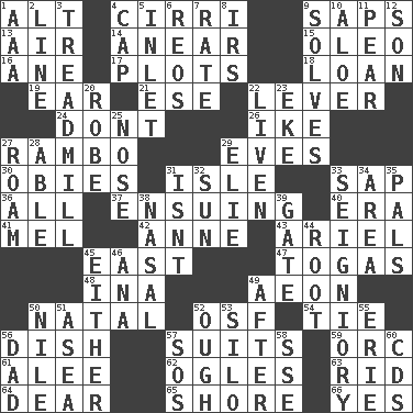 ACROSS 1. The first octave above the treble staff 4. High-altitude cloud 9. Plant excrements 13. Wind 14. Approach 15. Margarine 16. One (Scot) 17. Graphs 18. Grant temporary use of 19. Hearing organ 21. Compass dir. 22. Prying instrument 24. Do not 26. Mamie's mate 27. Role for Stallone 29. Nights before holidays 30. Off-Broadway awards 31. Capri or Wight 33. Plant excrement 36. Everything 37. Following as a consequence or result 40. Period 41. Cartoonist voice _ Blanc 42. Singer Murray 43. Satellite of Uranus 45. Compass direction 47. Ancient Roman robes 48. _ tizzy (2 wds.) 49. Period of immesurable duration 50. Brizilian seaport 52. Order of Saint Francis (abbr.) 54. Standoff 56. Food container 57. Costumes for special activities 59. The grampus (Milton) 61. Toward shelter 62. Stares 63. To free from 64. Letter starter 65. Dinah or Pauly 66. Consenting reply DOWN 1. American Automobile Association (abbr.) 2. Actor's bit 3. Excercise machine 4. Head covering 5. An arm off of a larger body of water 6. Vintage cars 7. Assign a rank or rating to 8. Big collection agency 9. Finds the solution 10. _ vera 11. Lightbulb-shaped fruit 12. Manchild 20. Loose flowing garment 22. Make or become more lively 23. Supplement with great effort 25. Olfactory organ 27. Wander aimlessly 28. Competent 29. Writer Wiesel 31. Is not 32. Player for Phoenix 33. Signiory (variant) 34. Length times width 35. Friends 38. Rhinal 39. Yard entry 44. Carrot, for example 45. One or the other of two 46. Santa ___, CA 49. Following 50. "Death on the ____" 51. Toward the sea 52. Ending for "Through" and "Enough" 53. Grain storage tower 55. One of the Great Lakes 56. Male parent 57. Mayday 58. Compass dir. 60. Music discs