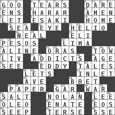 ACROSS 1. Thick or sticky substance 4. Lacerates 9. Have the gumption 13. Followers of ems 14. Ethiopian city, capital of Harari 15. So be it 16. Allow 17. 1973 Nobel Price Winner (Physics) Leo 18. Dwelling 19. Ocean 21. Sight organ 22. Sun: prefix 24. Be tempered by heat 26. Connecticut Ivy Leaguer 27. Mexican monetary units 29. Pale green bean 30. Place in a line 31. Mouths or openings 33. Pull behind 36. 54 in ancient Rome 37. Inveterate users 40. Mature 41. Perceive with the eye 42. Whirlpool 43. Stories 45. Allows 47. An arm off of a larger body of water 48. "___ Maria" 49. Cy Young winner Saberhagen 50. Some stationery 52. Slender fish 54. Armed conflict 56. Table seasoning 57. Pitcher Ryan 59. Area sheltered from the wind 61. Butter sub 62. Maternal 63. Greek goddess of the dawn 64. Ooze 65. Laconic 66. Compass dir. DOWN 1. Set 2. Singles 3. Clearly or manifestly demonstrative 4. Definite Article 5. Artist's stand 6. Like ___ of sunshine 7. Immoral or dissolute person 8. _ Lanka 9. Mexican or Central American flower 10. Mine, in Marseilles 11. San ____ (Riviera town) 12. Compass dir. 20. A really long time 22. Robbery 23. Shade tree 25. Toward the sea 27. Friends 28. Writer Wiesel 29. Made of lace 31. Probability 32. To free from 33. Baron Munchausen's specialties 34. Double curve, resembling the letter S 35. Compass direction 38. Prevent from occurring 39. Agitate 44. Afresh 45. Portable computer 46. First lady 49. Naughty children 50. Diluted with white 51. Toward shelter 52. Went 53. Having or resembling wings 55. Vintage cars 56. Distress signal 57. Fish or hair follower 58. Born 60. Compass dir.