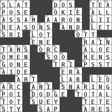 ACROSS 1. Narrow board 5. Two (Sp.) 8. Afternoon social gathering 11. Airs 12. Migrant worker of the '30s 14. 100% 15. Indian state 17. Composer Copland 18. Cards in a Roman deck? 19. Thinks logically 21. Plus 22. Allow 23. Indian title of respect (Mr.) 24. Car dealer's back yard 25. Baseball player Mel 27. Compass dir. 28. Water falling in drops from the sky 31. Scottish caps 35. The grampus (Milton) 37. Medicinal plant 38. Sign of things to come 39. "Barney Miller" actor Jack 41. Not women's 42. Went 43. Three (prefix) 45. Inconspicuous attention getter 46. Helper 47. Period 49. Nonscientific branch of learning 51. Experiment locale 52. Lion 55. Curve 57. Cuckoo 60. Catching in a trap 62. Luau course 63. Evade 65. "_____ Recall" 66. Small child 67. Chop _ 68. False hair 69. Filthy place 70. Plant excrement 71. Ancient Greek god of war DOWN 1. Practice fights 2. Failure 3. Slender Brazilian palm 4. Beverages made from leaves 5. ___ good deed 6. Gumbo ingredient 7. The Jewish people; Israel 8. Baron Munchausen's specialties 9. Writer Wiesel 10. Came down and settled, as after flight 13. Inside; within (prefix) 16. Undercover agent 17. Michaelmas daisies 20. Words to Nanette 26. _____ steamer (cargo ship) 29. Charged particles 30. Egg locale 31. Ancient Roman robe 32. Mine, in Marseilles 33. Ananias' fault 34. Scornful expression 36. Small bed 40. Threatening words 44. SW Asia republic 48. Blind as ____ 50. Small amounts or degrees 52. 61 cubic inches 53. Maternal 54. Stares 55. Tenement units (abbr.) 56. Carrot, for example 58. Horse sense 59. The main thing one is thinking about 61. Round or rotation of duties 64. Hustle