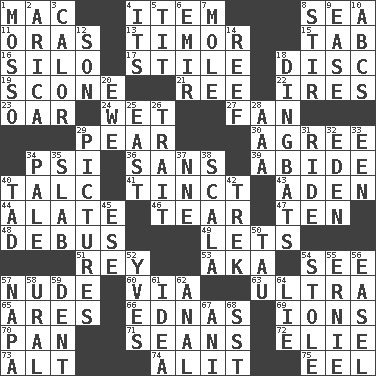 ACROSS 1. Apple computer (short form) 4. Detail 8. Ocean 11. Mouths or openings 13. The easternmost of the Lesser Sundas 15. Bar bill 16. Grain storage tower 17. Vertical member of a panel or frame 18. Compact _ 19. Biscuitlike quick bread 21. To separate or throw off 22. Angers 23. Boat paddle 24. Soggy 27. Avid follower 29. Lightbulb-shaped fruit 30. Match 34. Air pressure measure (abbr.) 36. Without 39. Stay 40. Baby powder 41. Tinged 43. An important port of Yemen 44. Having winglike extensions 46. Separate forcefully 47. Nine, plus one 48. Alight from a bus 49. Allows 51. Marina Del _, California 53. Alias (abbr.) 54. Observe 57. Naked 60. By way of 63. Extreme 65. Ancient Greek god of war 66. Ferber et al. 69. Charged atoms 70. Baking dish 71. Actors Connery and Penn 72. Writer Wiesel 73. Keyboard modifier key 74. Set down 75. Snakelike fish DOWN 1. With motion or animation 2. N. Chile seaport 3. Bodily heat indicating an inflammation 4. ___ a Wonderful Life 5. Teat (slang) 6. Independent ruler or chieftain 7. Undercover agent 8. Commotion 9. Relaxation 10. Lettered men learn these first 12. Male offspring 14. Coral ridge 18. Empty-headed or silly people 20. She-sheep 25. 90 degrees 26. Distinguishing feature 28. American Automobile Association (abbr.) 29. Photos 31. Travel on or in a vehicle 32. Paradise 33. Car or cant ending 34. Diluted with white 35. Broad, flat, thick piece 37. Compass dir. 38. Any of the three canals of the cochlea 40. Bit 42. Long journey 45. Compass dir. 50. The 19th letter of the Greek alphabet 52. Jacques Cousteau's middle name 54. Fur scarf 55. Bert's buddy 56. Artist's stand 57. California wine valley 58. Mountain range 59. Gouge 61. It may be bright or harebrained 62. Of or related to the anus 64. Whopper 67. Black tropical American cuckoo 68. Fast jet (abbr.)
