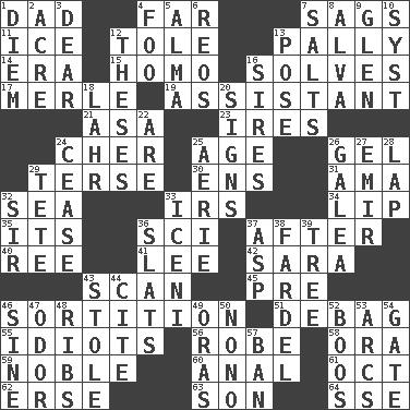 ACROSS 1. June honoree 4. At a great distance 7. Sinks 11. Frozen water 12. Lacquered or enameled metalware 13. Friendly 14. Epoch 15. Same (prefix) 16. Finds the solution 17. Haggard of country music 19. Helper 21. White ___ sheet 23. Angers 24. "Mermaids" star 25. Mature 26. Set 29. Laconic 30. Followers of ems 31. Nanny (var.) 32. Ocean 33. Big collection agency 34. Mouth edge 35. ___ a Wonderful Life 36. _-fi 37. Following 40. To riddle 41. Area sheltered from the wind 42. "Two Mules for Sister ____" 43. Glance over 45. Before (prefix) 46. Making a chance decision by using lots 51. Debunk (Brit. slang) 55. Foolish or stupid persons 56. Loose flowing garment 58. Mouth or opening 59. Impressive in appearance 60. Of or related to the anus 61. Sep. follower 62. Celtic language 63. Boy, to dad 64. Compass dir. DOWN 1. South Vietnam president (1954) 2. Measure of real estate 3. Letter starter 4. Egg _ yung 5. _ mater 6. Vintage cars 7. Table seasonings 8. Inventor's middle name 9. Small, secluded valley 10. System (abbr.) 12. College papers 13. Introduce or present, as a question 16. Founders of families 18. Cowardly lion portrayer 20. Public displays of written messages 22. "We ___ not amused" (Victoria) 24. Stop 25. Nest on high 26. An organ shaped like a helmet 27. Arab leader 28. Infant locale 29. Wig 32. Title for a knight 33. Ancient Celtic tribe of eastern Britain 36. Narrow boards 37. Viper 38. Pack 39. Family _ (genealogy) 43. Took without asking 44. Quote 46. Trig term 47. Scent 48. Teases 49. Mouths or openings 50. Words to Nanette 52. Expressions of contempt or scorn 53. Arches 54. Yard entry 57. Prohibit