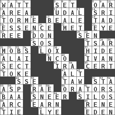 ACROSS 1. Electrical Unit 5. Put into a specified state 8. Boat paddle 11. Length times width 12. Hereditary estate 14. Indian title of respect (Mr.) 15. Singer Mel 17. Calif. Air Force Base 18. Small amount or degree 19. Gist 21. Was introduced to 22. Sight organ 23. Portuguese money of account (variant) 24. Spanish title 25. Elected rep. 27. Mayday 28. Russian ruler of old 31. Crowds into 35. Brine-cured salmon 37. Flintstone garb 38. Jai _ 39. Non-commissioned officer (abbr.) 41. _ the terrible 42. Religious group 43. Lyricist Gershwin 45. Sure thing 46. Casino tip 47. Keyboard modifier key 49. Compass dir. 51. The 23rd letter of the Hebrew alphabet 52. R.R. building 55. Cleo's killer 57. Actress Charlotte 60. Speakers 62. Sound made by sheep 63. Contemptuous expression 65. Grain storage towers 66. Curve 67. Merit 68. French philosopher Descartes 69. Standoff 70. Sodium hydroxide 71. Paradise DOWN 1. Wetness 2. Came up 3. Laconic 4. Not wild 5. Take to court 6. Dutch treat 7. Falsehood 8. Clearly or manifestly demonstrative 9. Like ___ of sunshine 10. Travel on an animal 13. Allows 16. Extremities 17. Gillaume's butler role 20. Calm and collected 26. Value system 29. The sixth month of the Jewish calendar 30. Monthly bill 31. Vertical spar for supporting sails 32. Margarine 33. Keyboard key 34. Locates 36. One more than ninety 40. Speaker 44. Having or resembling wings 48. It was, poetically 50. Celtic language 52. Having a sole or soles 53. Marketplace scale 54. NE Netherlands city 55. Blind as ____ 56. Indian skirt 58. Of or related to the anus 59. Suggestive of the supernatural 61. Hoop that covers a wheel 64. Compass dir.