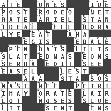 ACROSS 1. Had dinner 4. Washington bills 8. Binary compound 11. Mail 13. Cowboy competition 15. Fish or hair follower 16. Assign a rank or rating to 17. Satellite of Uranus 18. Comedian Laurel of Laurel & Hardy 19. Perfect 21. Pipe bend 22. Israeli folk dance 23. Potassium hydroxide 24. Consume 27. Wet nurse (var.) 29. The front part of a cuirass 30. Peak District village in England 34. Fenced enclosure 36. Raised platform 39. Ms. Damita and namesakes 40. Narrow board 41. Ferber et al. 43. Immeasurably long periods of time 44. Spanish missionary in California 46. Prepare for publication 47. Observe 48. Artist's stand 49. For fear that 51. American Automobile Association (abbr.) 53. R.R. building 54. Mayday 57. Vertical spar for supporting sails 60. Born 63. _ dish (used to culture cells) 65. "If ____ say so..." 66. Declaim 69. Den 70. Car dealer's back yard 71. Olfactory organs 72. _ gin 73. Cards in a Roman deck? 74. Transmitted 75. Followers of ems DOWN 1. Showery time 2. Sycophant 3. First name in cosmetics 4. Mouth or opening 5. And not 6. Singer Brickell 7. Sew up the eyelids of hawks and falcons 8. To the inside or interior of 9. Letter starter 10. Inactive volcano in Sicily 12. Beverage made from leaves 14. Spanish pot 18. Most questionable 20. Part of a journey 25. Helper 26. Sadhe (variant) 28. Cartoonist voice _ Blanc 29. Plea 31. Medicinal plant 32. Actor's bit 33. Curvy letter 34. Entreaty 35. Hearing organs 37. Working for oneself (abbr.) 38. Travels by water 40. Compass dir. 42. Proofreading order 45. Chicken ___ king 50. Plant excrement 52. Soon (poet.) 54. Lacking originality or spontaneity 55. Constellation of myth 56. Fathers 57. Place where flour is made 58. Mine, in Marseilles 59. Suttee (variant) 61. Greek god of love 62. Comfort 64. Raised railways 67. "___ Little Indians" 68. Eastern Standard Time (abbr.)