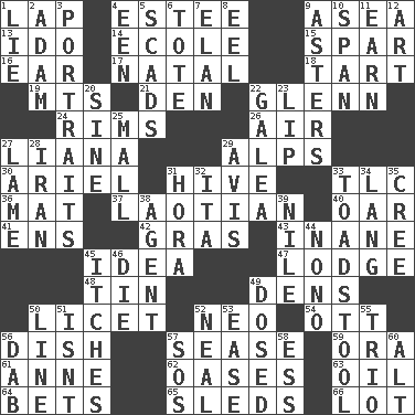 ACROSS 1. Pet locale 4. First name in cosmetics 9. At sea 13. Wedding promise 14. Learning spot: Fr. 15. Coast Guard woman 16. Ewer handle 17. Relating to or accompanying birth 18. Small pie 19. Mountains (abbr.) 21. Lair 22. American astronaut and politician John 24. Basketball hoops 26. Atmosphere 27. Climbing, woody, usually tropical vines 29. High mountains 30. Satellite of Uranus 31. Hub of activity 33. Affectionate concern, for short 36. Floor covering 37. Of or relating to Laos or its people 40. Rowing implement 41. Followers of ems 42. Pate de foie ____ 43. Empty; void 45. The content of cognition 47. Inn 48. Metal container 49. Cub Scout units 50. It is permitted: Lat. 52. Modern: prefix 54. Baseball player Mel 56. Food container 57. Gospel singer Marvin 59. Mouth or opening 61. Queen of England 1702-14 62. Fertile tracts in a desert 63. Lubricate 64. Stakes 65. Bobsleighs 66. Car dealer's back yard DOWN 1. Whopper 2. First of billions? 3. Likenesses of persons 4. Car or cant ending 5. Heaps 6. Haul 7. Liveliness 8. Snakelike fish 9. Michaelmas daisies 10. Connect, as a bridge 11. Merit 12. Tate display 20. Trig term 22. An organ shaped like a helmet 23. Mouth edge 25. Shopping center 27. Unable to walk 28. SW Asia republic 29. Opinion 31. Israeli folk dance 32. Call ___ day 33. Inedible or poisonous agaric 34. Long (Scottish) 35. Algonquian 38. Representative 39. Mediterranean tributary 44. Words to Nanette 45. Irritating cutaneous sensations 46. Expire 49. Administered medicine 50. Actor's bit 51. Is not 52. Actress Patricia 53. Comfort 55. Musical group of three 56. Apply (a substance) by light strokes 57. Mayday 58. Double-curved letter 60. The first octave above the treble staff