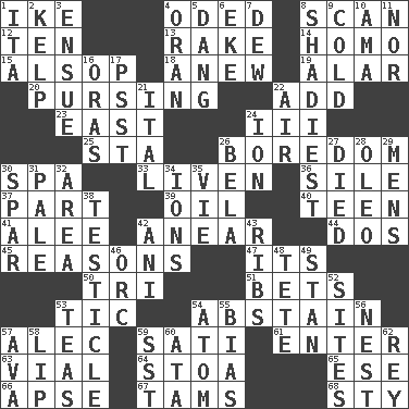 ACROSS 1. Mamie's husband 4. Wrote a lyric poem 8. Examine hastily 12. "___ Little Indians" 13. Immoral or dissolute person 14. Same (prefix) 15. Columnist Joseph or Stewart 18. Afresh 19. Having or resembling wings 20. Puckering 22. Find the sum of 23. 90 degrees 24. One more than two 25. R.R. building 26. Mood resulting from idleness 30. Health resort 33. Make or become more lively 36. Filth; sediment 37. Role in a play 39. Lubricate 40. Adolescent 41. Toward shelter 42. Approach 44. Two (Sp.) 45. Thinks logically 47. ___ a Wonderful Life 50. Three (prefix) 51. Antes 53. Nervous spasm 54. Choose not to consume 57. Actor Baldwin 59. Suttee (variant) 61. Keyboard key 63. Small bottle 64. Portico 65. Compass dir. 66. Domed church section 67. Scottish caps 68. Filthy place DOWN 1. Call ___ day 2. Seaweed 3. Follow as a consequence or result 4. NW Algerian seaport 5. Mild oath, euphamism for damn 6. Supplement with great effort 7. Morning condensation 8. Most dubious of character or honesty 9. Chilled 10. Nursemaid (var.) 11. Not either 16. Mouths or openings 17. Inconspicuous attention getter 21. Slanted text style (abbr.) 22. Wind 24. Electrically charged atom 26. Actor Lugosi 27. Passed on 28. Margarine 29. Not women's 30. Coast Guard woman 31. Diluted with white 32. Type of rug 34. Charged atoms 35. Compete 38. One of the two male reproductive glands 42. Cuckoo 43. Teases 46. The grampus (Milton) 48. False hair 49. Comedian Laurel of Laurel & Hardy 52. Locates 53. Beverages made from leaves 54. Tiny particle 55. Prejudice 56. Egg locale 57. Actress Gardner 58. Mouth edge 59. Fast jet (abbr.) 60. "One Day ___ Time" 62. Marina Del _, California