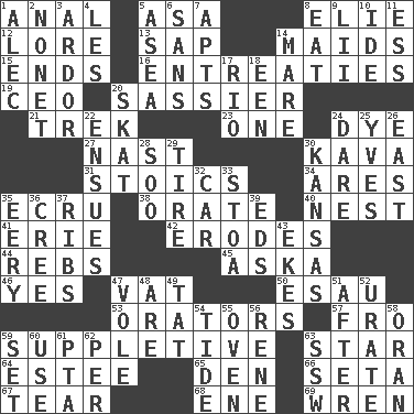ACROSS 1. Of or related to the anus 5. White ___ sheet 8. Writer Wiesel 12. Old wives' tales, e.g. 13. Plant excrement 14. Women servants 15. Conclusions 16. Pleas 19. Corporate head (abbr.) 20. More lively and spirited 21. Long journey 23. Single 24. Color 27. Political cartoonist Thomas 30. Polynesian shrub of the pepper family 31. Unemotional ones 34. Ancient Greek god of war 35. Shade of tan 38. Declaim 40. Egg locale 41. 4th largest of the Great Lakes 42. Eats (away) 44. Confederate soldiers (slang) 45. "____ silly question..." 46. It is so 47. Large container 50. Son of Isaac 53. Speakers 57. Back 59. Supplementary 63. Play the lead 64. First name in cosmetics 65. Lair 66. Stalk of a moss capsule 67. Lacerate 68. Compass dir. 69. Songbird DOWN 1. Actor Baldwin 2. Music written for nine 3. Zeal 4. French article 5. Toward the sea 6. Without 7. Flats, for short 8. Consume 9. Cards in a Roman deck? 10. Binary compound 11. Double-curved letter 14. Female horse 17. _ de Janeiro 18. Car or cant ending 20. Three-handed card game 22. Takes place subsequently 24. Have the gumption 25. Jacques Cousteau's middle name 26. Compass direction 28. "Barney Miller" actor Jack 29. Hoop that covers a wheel 30. Sunflower state 32. Auto 33. Portico 35. Suggestive of the supernatural 36. Algonquian 37. Chest bones 39. Begley and Asner 43. Makes supply last 47. Short-tailed, large-bodied rat 48. "We ___ not amused" (Victoria) 49. Make lace 51. Following 52. A salt of uric acid 54. Periodic rise and fall of the sea level 55. Baking chamber 56. French philosopher Descartes 58. NW Algerian seaport 59. Arrange properly for use 60. Purpose 61. Parent Teacher Assoc. 62. For each 63. Compass dir.