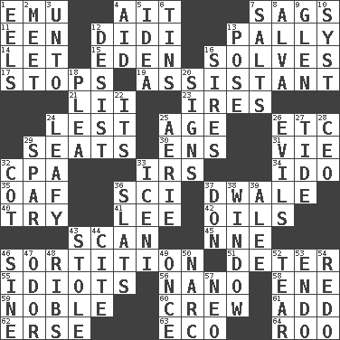 ACROSS 1. Australian flightless bird 4. Small island 7. Settles 11. Car or cant ending 12. "You Light Up My Life" star Conn 13. Chummy 14. Allow 15. Paradise 16. Finds the solution 17. Ceases 19. Helper 21. Cards in a Roman deck? 23. Angers 24. For fear that 25. Grow older 26. And so on (abbr.) 29. Theater features 30. Followers of ems 31. Compete 32. Accounting whiz (abbr.) 33. Big collection agency 34. Wedding promise 35. Clumsy lout 36. _-fi 37. A sleeping potion; an opiate (poet.) 40. Attempt to accomplish something 41. Area sheltered from the wind 42. Petroleums 43. Glance over 45. Compass dir. 46. Casting lots 51. Prevent from occurring 55. Foolish or stupid persons 56. Billionth: prefix 58. Compass dir. 59. Impressive in appearance 60. Ship's personnel 61. Find the sum of 62. Celtic language 63. Environmental prefix 64. Friend of Pooh DOWN 1. Snakelike fish 2. Rendezvous 3. To (old English) 4. Help 5. The main thing one is thinking about 6. Metal containers 7. Table seasonings 8. Inventor's middle name 9. Small, secluded valley 10. System (abbr.) 12. Stop 13. Introduce or present, as a question 16. Male parents of animals 18. Entreaty 20. Omens 22. It is 24. Like summer trees 25. Nest on high 26. Vices 27. Event that recurs at intervals 28. Corporate head (abbr.) 29. Coast Guard woman 32. Small bed 33. Ancient Celtic tribe of eastern Britain 36. Narrow boards 37. Spanish title 38. Light entry point 39. Toward shelter 43. Took without asking 44. Quote 46. Trig term 47. Aroma 48. Teases 49. Single time 50. Drug cop 52. Separate forcefully 53. Inside; within (prefix) 54. Redecorate 57. Modern: prefix