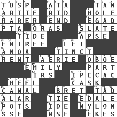 ACROSS 1. Cook's measure (abbr.) 5. _ moment's notice (2 wds.) 8. Scottish cap 11. Nick name for Arthur 13. To free from 14. Hollow 15. More valued for its uncommonness 16. Conclusion 17. Mild oath 18. Parent Teacher Association (abbr.) 19. Mouths or openings 21. Chalkboard 22. Event that recurs at intervals 24. Domed church section 25. Main course 27. Luau accessory 29. Small Philippine buffalo 30. Tinged 32. Monthly bill 33. Nest on high 35. Mitch Miller's instrument 39. Poet Dickinson 41. Piece 42. Big collection agency 43. Medicinal drug used to evoke vomiting 45. The bottom of a shoe or boot 48. Keg 49. Lessep's creation 50. Cy Young winner Saberhagen 52. Small amount or degree 55. Having or resembling wings 56. Make a knot 57. Peak District village in England 59. Cooking vessels 60. Binary compound 61. High-strength synthetic material 62. Compass dir. 63. Science/research agcy. 64. Supplements with great effort DOWN 1. Canvas cover 2. Naughty child 3. Ski resort town in Vermont 4. Sliced dessert 5. Length times width 6. Canisters 7. Say or write further 8. Ancient Roman robes 9. Having winglike extensions 10. Ancient Persian 12. Wear away 14. Assist 20. To riddle 21. Ketch in the Levant 23. Feeling or showing extreme anger 25. Ewer handle 26. Compass dir. 27. Cards in a Roman deck? 28. Compass dir. 30. Attempt to accomplish something 31. Drinks excessively 33. Wind 34. Raised railways 36. Sass 37. Mouth or opening 38. And so on (abbr.) 40. Place where flour is made 43. Frozen water 44. Eucharist need 45. Auras 46. Related on the mother's side 47. Hearing organs 49. Balmoral and tarboosh 50. Auction offers 51. Coral collection 53. _ vera 54. Hiding places for outlaws 56. Shallow baking pan 58. Color