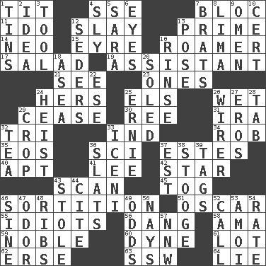 ACROSS 1. Teat (slang) 4. Compass dir. 7. Group of countries in special alliance 11. Wedding promise 12. Kill 13. First class 14. Modern: prefix 15. Jane of fiction 16. Wanderer 17. First course 19. Aide 21. Perceive with the eye 23. Washington bills 24. Possessive pronoun 25. Raised railways 26. Soggy 29. Stop 30. Portuguese money of account (variant) 31. Lyricist Gershwin 32. Three (prefix) 33. Indiana (abbr.) 34. Director Reiner 35. Greek goddess of the dawn 36. _-fi 37. _____ Park, CO 40. Fitting 41. Area sheltered from the wind 42. Play the lead 43. Examine hastily 45. Coat; cloak 46. Casting lots 51. Motion picture award 55. Foolish or stupid persons 56. Mild oath, euphamism for damn 58. Nursemaid (var.) 59. Having high moral qualities 60. Unit of force 61. Car dealer's back yard 62. Celtic language 63. Compass dir. 64. Whopper DOWN 1. Airtight sealed metal containers 2. It may be bright or harebrained 3. Utensil 4. Insidious 5. "Two Mules for Sister ____" 6. Sight organs 7. Naughty children 8. Pale green bean 9. Presage 10. Foregone conclusion 12. Spring feasts 13. Introduce or present, as a question 16. Wash lightly 18. Toward the sea 20. Having a sole or soles 22. Compass dir. 24. Robbery 25. Bert's buddy 26. One who wires 27. Greek god of love 28. Keyboard key 29. Riding implement 32. Beverage made from leaves 33. Ancient Celtic tribe of eastern Britain 36. Narrow boards 37. Eastern Standard Time (abbr.) 38. Moe Howard, for one 39. Labels 43. Took without asking 44. Quote 46. Trig term 47. Aroma 48. Teases 49. Likelihood 50. Negative votes 52. Give a ring to 53. Mine, in Marseilles 54. Assign a rank or rating to 57. Compass dir.