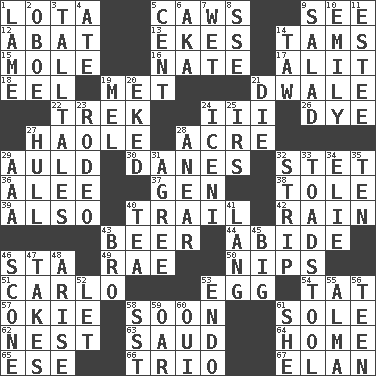ACROSS 1. Globular water bottle used in Asia 5. Crow sounds 9. Observe 12. Blind as ____ 13. Supplements with great effort 14. Scottish caps 15. Undercover agent 16. Nathan's nickname 17. Came down and settled, as after flight 18. Snakelike fish 19. Was introduced to 21. A sleeping potion; an opiate (poet.) 22. Long journey 24. One more than two 26. Color 27. White Person, in Hawaii 28. 1/640 square mile 29. Old (Scot.) 30. Natives or inhabitants of Denmark 32. Proofreading order 36. Toward shelter 37. Commissioned mil. rank 38. Lacquered or enameled metalware 39. In addition 40. Get behind 42. Water falling in drops from the sky 43. Fermented drink made from hops 44. Tolerate 46. R.R. building 49. Actress Charlotte 50. Cuts off 51. Monte _, Las Vegas Hotel/Casino 53. Oval reproductive body of a fowl 54. Make lace 57. Migrant worker of the '30s 58. Within a short period 61. Flatfish 62. Egg locale 63. Saudi Arabian king (1953-1964) 64. Residence 65. Compass dir. 66. Musical group of three 67. Style DOWN 1. Unable to walk 2. Mitch Miller's instrument 3. Baron Munchausen's specialties 4. Had dinner 5. Penny 6. Alias (abbr.) 7. Dripping 8. Compass dir. 9. Vegetable dish 10. Poet Dickinson 11. First name in cosmetics 14. The 23rd letter of the Hebrew alphabet 19. Cartoonist voice _ Blanc 20. Supplemented with great effort 21. Pass on 23. Cowboy competition 24. Ancient Celtic tribe of eastern Britain 25. Big collection agency 27. Frame or body of a ship 28. Approach 29. Auto club (abbr.) 31. Match 32. Remove all contents or possession from 33. Inedible or poisonous agaric 34. Writer Wiesel 35. "___ Little Indians" 40. Afternoon social gathering 41. Long (Scottish) 43. Sis' sibling 45. Large 46. Biscuitlike quick bread 47. Proceeds 48. Get up 52. Allow 53. Inside; within (prefix) 55. _ mater 56. Adolescent 58. Fast jet (abbr.) 59. Boat paddle 60. Fr. "Yes" 61. A female animal or person