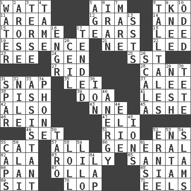 ACROSS 1. Electrical Unit 5. Direct toward a target or goal 8. Ring climax 11. Length times width 12. Pate de foie ____ 14. Plus 15. Singer Mel 17. Pulls apart 18. Area sheltered from the wind 19. Gist 21. Remaining after all deductions 22. Directed 23. To riddle 24. Commissioned military rank (abbr.) 25. Fast jet (abbr.) 27. To free from 28. Patter 31. Fastener 35. Flowery wreath 37. Toward shelter 38. Expression of disdain 39. ___ good deed 41. For fear that 42. In addition 43. Compass dir. 45. American tennis player Robert 46. It's straight from the horse's mouth 47. Biblical high priest 49. Arrange properly for use 51. _ de Janeiro 52. Followers of ems 55. Feline 57. Everything 60. Commissioned military rank 62. Wing 63. Agitated, as a liquid 65. Before Barbara or Clara 66. Baking dish 67. Water jar 68. Thailand, formerly 69. Be seated 70. Chop off 71. Snakelike fish DOWN 1. Wetness 2. Came up 3. Laconic 4. Not wild 5. Mature 6. SW Asia republic 7. Female horse 8. Baron Munchausen's specialties 9. Leg joint 10. Wrote a lyric poem 13. Fast planes 16. Engineer (abbr.) 17. Looked after 20. To provide with a ceiling 26. Any of the three canals of the cochlea 29. Delicate 30. False hair 31. Practice fight 32. The longest river in the world 33. Aide 34. Give a jingle 36. Electrically charged atom 40. Disorder of the immune system 44. Writer Wiesel 48. Charged particles 50. Pacific island yam 52. Bert's buddy 53. Relating to or accompanying birth 54. Shuts with force 55. Smile enhancers 56. Mountain range southwest of Kyrgyzstan 58. Hang loosely or laxly 59. _ and Stitch 61. Comfort 64. Pet locale