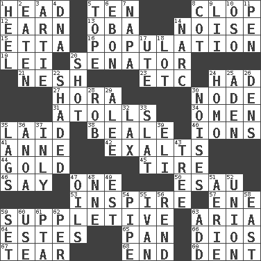 ACROSS 1. Froth on beer 5. Nine, plus one 8. Hoof sound 12. Merit 13. Chief or king in Benin or Nigeria 14. Annoying sound 15. Singer James 16. Census information 19. Luau accessory 20. Legislator 21. Tender 23. And so on (abbr.) 24. Possessed 27. Israeli folk dance 30. Connecting point 31. Ringlike coral islands and reefs 34. Sign of something about to happen 35. Put down 38. Memphis, Tenn. Street 40. Charged particles 41. Singer Murray 42. Honors 44. Aureate 45. Hoop that covers a wheel 46. Declare 47. Single 50. Son of Isaac 53. Heighten or intensify 57. Compass dir. 59. Supplementary 63. Operatic vocal solo 64. _____ Park, CO 65. Baking dish 66. "Vaya con ____" 67. Lacerate 68. Conclude 69. Gouge DOWN 1. The bottom of a shoe or boot 2. Eroded 3. Nick name for Arthur 4. Heredity factor (abbr.) 5. Drink excessively 6. Inky black, to poets 7. California wine valley 8. Small bed 9. Cards in a Roman deck? 10. Bear (Spanish) 11. Writing instrument 14. Drug cop 17. Shoshoni 18. Car dealer's back yard 20. Went for two points 22. Cast a shadow over 24. Like (prefix) 25. An important port of Yemen 26. Hiding places for outlaws 28. Director Reiner 29. Toward shelter 30. Annoying sounds 32. Not strict 33. Narrow board 35. Straggles 36. Small Philippine buffalo 37. In an inward manner 39. Biblical high priest 43. Woody plant 47. Petroleums 48. Compass dir. 49. Eastern Standard Time (abbr.) 51. Nest on high 52. The state of being joined or united 54. Corncob 55. "Terrible" tsar 56. Tear apart 58. Compass direction 59. Arrange properly for use 60. Purpose 61. Parent Teacher Assoc. 62. For each 63. Find the sum of