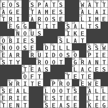 ACROSS 1. Greek goddess of the dawn 4. Arguments over trivial matters 9. Electrical Unit 13. Mature 14. Softens 15. Jai ____ 16. Three (prefix) 17. Came up 18. Citrus frut 19. Oval reproductive body of a fowl 21. Teat (slang) 22. Table seasonings 24. Common sense 26. Eisenhower's nickname 27. Off-Broadway awards 29. Narrow board 30. Trap for birds or small mammals 31. Deli pickle 33. Compass dir. 36. Ewer handle 37. Boisterous (Brazilian Portuguese) 40. Sliced dessert 41. Filthy place 42. Carrot, for example 43. Let have 45. Beverages made from leaves 47. Shoestrings 48. Often (poetically) 49. Wig 50. Compose 52. Adept person 54. She-sheep 56. Lick closed 57. Plunders 59. 100% 61. 4th largest of the Great Lakes 62. First name in cosmetics 63. Whopper 64. Portable shelter 65. Gospel singer Marvin 66. Cask DOWN 1. Consume 2. Legendary monster 3. Signiory (variant) 4. R.R. building 5. Actors' quests 6. Mine, in Marseilles 7. Trial 8. Compass dir. 9. Place for singles 10. Came down and settled, as after flight 11. Scottish caps 12. Neckwear 20. Travels 22. Beverly of Met fame 23. Alias (abbr.) 25. One who makes use of a thing 27. Singles 28. Water vessel 29. Narrow opening 31. "Vaya con ____" 32. Wedding promise 33. High altitude stroll 34. Trig term 35. Moistens 38. A salt of uric acid 39. Stare 44. Pace 45. Rest room 46. Newt 49. Lugs 50. Past tense of be (plural) 51. Precipitation 52. Introduce or present, as a question 53. Round or rotation of duties 55. Writer Wiesel 56. Put into a specified state 57. French article 58. Perceive with the eye 60. Part of a journey