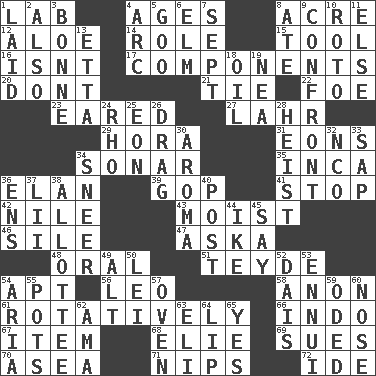 ACROSS 1. Experiment locale 4. Eons 8. 43,560 square feet 12. Medicinal plant 14. Hero or heavy, e.g. 15. Instrument 16. Is not 17. Pieces 20. Do not 21. Make a knot 22. Enemy 23. Having ears or earlike features 27. Cowardly lion portrayer 29. Israeli folk dance 31. Immeasurably long periods of time 34. Underwater navigation system 35. South American Indian 36. Enthusiasm 39. Grand Old Party 41. Obstruct or block passage 42. "Death on the ____" 43. Damp 46. Filth; sediment 47. "____ silly question..." 48. Spoken 51. Miss Universe 1986, Barbara Palacios _ 54. Fitting 56. Lion 58. At once, immediately (arch.) 61. Rotating or pertaining to rotation 66. Southeast Asian peninsula 67. A whole individual unit 68. Writer Wiesel 69. Takes to court 70. At sea 71. Pinches, bites 72. Binary compound DOWN 1. Put down 2. In addition 3. Child's nurse 4. Curve 5. Thick or sticky substance 6. Shade tree 7. Back-to-school mo. 8. Had dinner 9. Meet 10. Printing process, for short 11. Otherwise 13. Singer James 18. Petroleum 19. Teachers' org. 24. 17th letter of the Greek alphabet 25. Period of immesurable duration 26. To trail on the ground 28. Robbery 30. Scent 32. Non-commissioned officer (abbr.) 33. Plant excrement 34. Scornful expression 36. Followers of ems 37. Cards in a Roman deck? 38. One to whom something is allotted 40. Mail 44. Eisenhower's nickname 45. Declare 49. The first octave above the treble staff 50. Flowery wreath 52. Raised platform 53. World-weariness 54. Roberta Peters solo 55. Plant holders 57. Baking chamber 59. Wrote a lyric poem 60. Sense of smell 62. Nanny (var.) 63. Biblical high priest 64. Mouth edge 65. Consenting reply